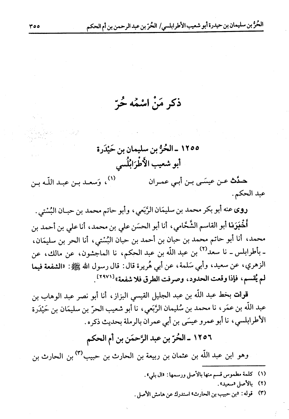 1255 - الحر بن سليمان بن حيدرة أبو شعيب الاطرابلسي حدث عن عيسى بن أبي عمران (1) وسعد بن عبد الله بن عبد الحكم روى عنه أبو بكر محمد بن سليمان الربعي وأبو حاتم محمد بن حبان البستني أخبرنا أبو القاسم الشحامي أنا أبو الحسن علي بن محمد أنا علي بن احمد بن محمد أنا أبو حاتم محمد بن حبان بن احمد بن حبان البستي أنا الحر بن سليمان بأطرابلس نا سعد (2) بن عبد الله بن عبد الحكم نا الماجشون عن مالك عن الزهري عن سعيد وأبي سلمة عن أبي هريرة قال قال رسول الله صلى الله عليه وسلم الشفعة فيما لم يقسم فإذا وقعت الحدود وصرفت الطرق فلا شفعة