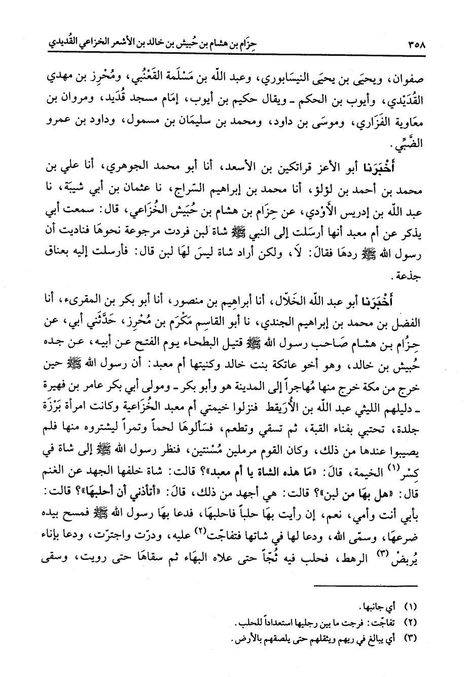 صفوان ويحيى بن يحيى النيسابوري وعبد الله بن مسلمة القعنبي ومحرز بن مهدي القديدي وايوب بن الحكم ويقال حكيم بن ايوب امام مسجد قديد ومروان بن معاوية الفزاري وموسى بن داود ومحمد بن سليمان بن مسمول وداود بن عمرو الضبي أخبرنا أبو الاعز قراتكين بن الاسعد أنا أبو محمد الجوهري أنا علي بن محمد بن احمد بن لؤلؤ أنا محمد بن إبراهيم السراج نا عثمان بن أبي شيبة نا عبد الله بن إدريس الاودي عن حزام بن هشام بن حبيش الخزاعي قال سمعت أبي يذكر عن أم معبد إنها ارسلت إلى النبي صلى الله عليه وسلم شاة لبن فردت مرجوعة نحوها فناديت أن رسول الله صلى الله عليه وسلم ردها فقال لا ولكن أراد شاة ليس لها لبن قال فأرسلت إليه بعناق جذعة أخبرنا أبو عبد الله الخلال أنا إبراهيم بن منصور أنا أبو بكر بن المقرئ أنا الفضل بن محمد بن إبراهيم الجندي نا أبو القاسم مكرم بن محرز حدثني أبي عن حزام بن هشام صاحب رسول الله صلى الله عليه وسلم قتيل البطحاء يوم الفتح عن أبيه عن جده حبيش بن خالد وهو اخو عاتكة بنت خالد وكنيتها أم معبد أن رسول الله صلى الله عليه وسلم حين خرج من مكة خرج منها مهاجرا إلى المدينة هو وأبو بكر ومولى أبي بكر عامر بن فهيرة دليلهم الليثي عبد الله بن الاريقط فنزلوا خيمتي أم معبد الخزاعية وكانت امرأة برزة جلدة تحتبي بفناء القبة ثم تسقي وتطعم فسألوها لحما وتمرا ليشتروه منها فلم يصيبوا عندها من ذلك وكان القوم مرملين مسنتين فنظر رسول الله صلى الله عليه وسلم إلى شاة في كسر (1) الخيمة قال ما هذه الشاة يا أم معبد قالت شاة خلفها الجهد عن الغنم قال هل بها من لبن قالت هي أجهد من ذلك قال أتأذني أن احلبها قالت بأبي أنت وأمي نعم أن رأيت بها حلبا فاحلبها فدعا بها رسول الله صلى الله عليه وسلم فمسح بيده ضرعها وسمى الله ودعا لها في شاتها فتفاجت (2) عليه ودرت واجترت ودعا بإناء يربض (3) الرهط فحلب فيه ثجا حتى علاء البهاء ثم سقاها حتى رويت وسقى
