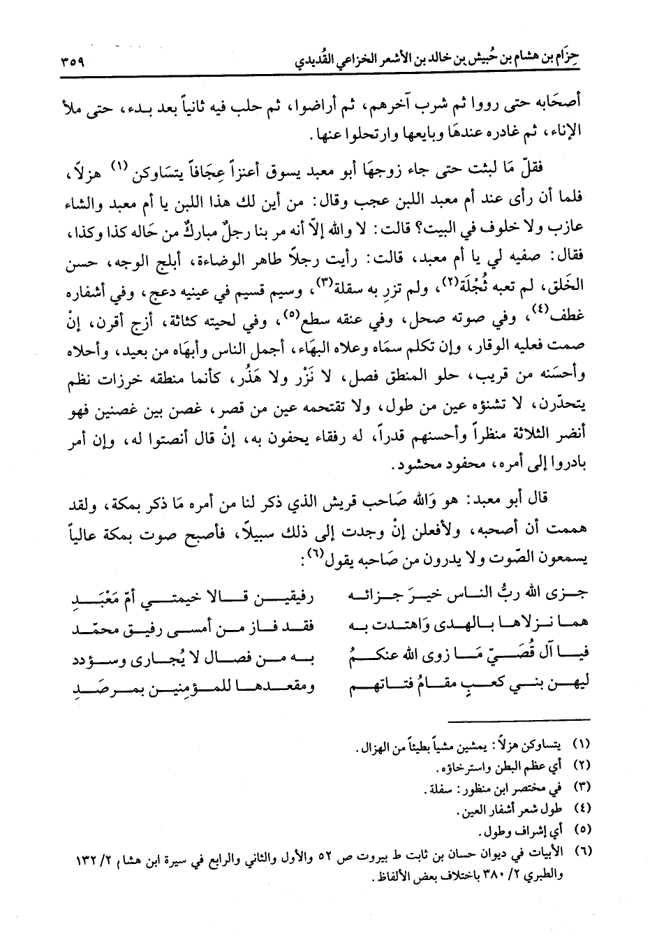 (6) الابيات في ديوان حسان بن ثابت ط بيروت ص 52 والاول والثاني والرابع في سيرة ابن هشان 2 / 132 والطبري 2 / 380 باختلاف بعض الالفاظ