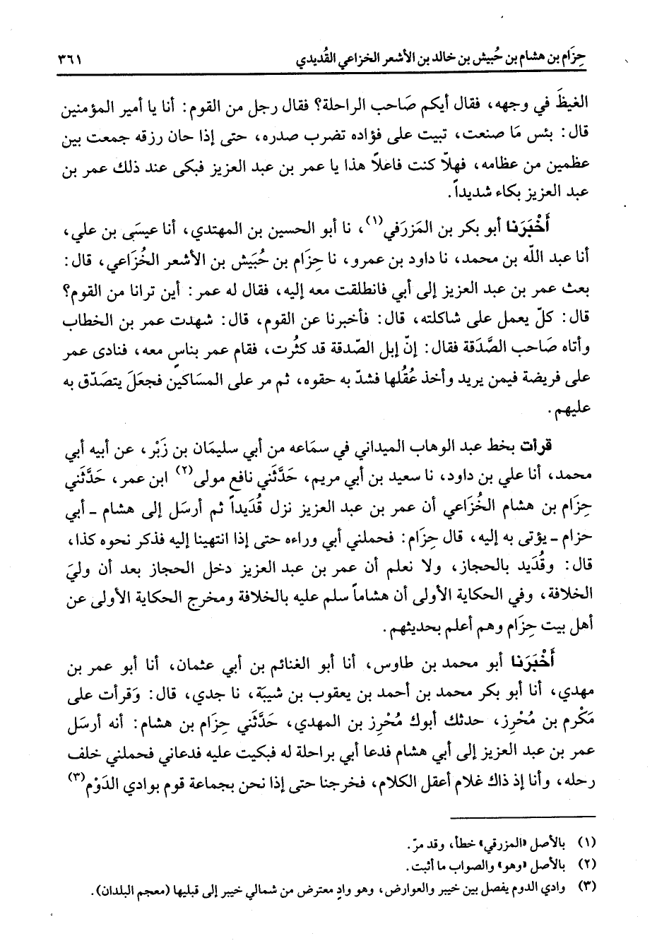 الغيظ في وجهه فقال ايكم صاحب الراحلة فقال رجل من القوم أنا يا أمير المؤمنين قال بئس ما صنعت تبيت على فؤاده تضرب صدره حتى إذا حان رزقه جمعت بين عظمين من عظامه فهلا كنت فاعلا هذا يا عمر بن عبد العزيز فبكى عند ذلك عمر بن عبد العزيز بكاء شديدا أخبرنا أبو بكر بن المزرفي (1) نا أبو الحسين بن المهتدي أنا عيسى بن علي أنا عبد الله بن محمد نا داوود بن عمرو نا حزام بن حبيش بن الاشعر الخزاعي قال بعث عمر بن عبد العزيز إلى أبي فانطلقت معه إليه فقال له عمر اين ترانا من القوم قال كل يعمل على شاكلته قال فاخبرنا عن القوم قال شهدت عمر بن الخطاب وأتاه صاحب الصدقة فقال أن ابل الصدقة قد كثرت فقام عمر بناس معه فنادى عمر على فريضة فيمن يريد وأخذ عقلها فشد به حقوه ثم مر على المساكين فجعل يتصدق به عليهم قرأت بخط عبد الوهاب الميداني في سماعه من أبي سليمان بن زبر عن أبيه أبي محمد أنا علي بن داود نا سعيد بن أبي مريم حدثني نافع مولى (2) ابن عمر حدثني حزام بن هشام الخزاعي أن عمر بن عبد العزيز نزل قديدا ثم أرسل إلى هشام أبي حزام يؤتى به إليه قال حزام فحملني أبي وراءه حتى إذا انتهينا إليه فذكر نحوه كذا قال وقديد بالحجاز ولا نعلم أن عمر بن عبد العزيز دخل الحجاز بعد أن ولي الخلافة وفي الحكاية الأولى أن هشاما سلم عليه بالخلافة ومخرج الحكاية الأولى عن أهل بيت حزام وهم اعلم بحديثهم اخبرنا أبو محمد بن طاوس أنا أبو الغنائم بن أبي عثمان أنا أبو عمر بن مهدي أنا أبو بكر محمد بن احمد بن يعقوب بن شيبة نا جدي قال وقرأت على مكرم بن محرز حدثك أبوك محرز بن المهدي حدثني حزام بن هشام انه أرسل عمر بن عبد العزيز إلى أبي هشام فدعا أبي براحلة له فبكيت عليه فدعاني فحملني خلف رحله وأنا إذ ذاك غلام اعقل الكلام فخرجنا حتى إذا نحن بجماعة قوم بوادي الدوم (3)