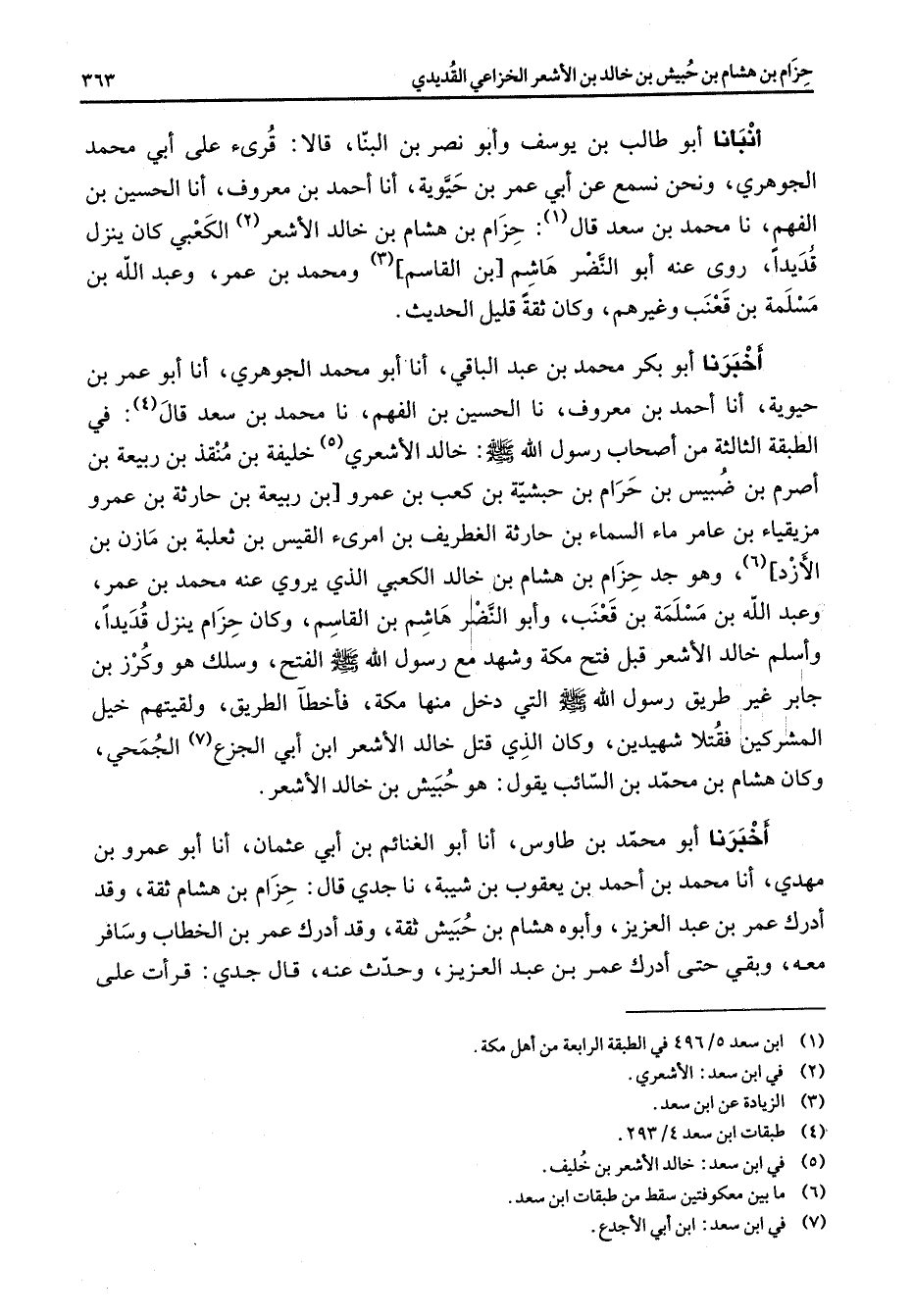 أنبأنا أبو طالب بن يوسف وابو نصر بن البنا قالا قرئ على أبي محمد الجوهري ونحن نسمع عن أبي عمر بن حيوية أنا احمد بن معروف أنا الحسين بن الفهم نا محمد بن سعد قال (1) حزام بن هشام بن خالد الاشعر (2) الكعبي كان ينزل قديدا روى عنه أبو النضر هاشم بن القاسم (3) ومحمد بن عمر وعبد الله بن مسلمة بن قعنب وغيرهم وكان ثقة قليل الحديث اخبرنا أبو بكر محمد بن عبد الباقي أنا أبو محمد الجوهري أنا أبو عمر بن حيوية أنا احمد بن معروف نا الحسين بن الفهم نا محمد بن سعد قال (4) في الطبقة الثالثة من أصحاب رسول الله صلى الله عليه وسلم خالد الأشعري (5) خليفة بن منقذ بن ربيعة بن اصرم بن ضبيس بن حرام بن حبشية بن كعب بن عمرو بن ربيعة بن حارثة بن عمرو مزيقياء بن عامر ماء السماء بن حارثة الغطريف بن امرئ القيس بن ثعلبة بن مازن بن الازد (6) وهو جد حزام بن هشام بن خالد الكعبي الذي يروي عنه محمد بن عمر وعبد الله بن مسلمة بن قعنب وأبو النضر هاشم بن القاسم وكان حزام ينزل قديدا واسلم خالد الاشعر قال قبل فتح مكة وشهد مع رسول الله صلى الله عليه وسلم الفتح وسلك هو وكرز بن جابر غير طريق رسول الله صلى الله عليه وسلم التي دخل منها مكة فأخطأ الطريق ولقيتهم خيل المشركين فقتلا شهيدين وكان الذي قتل خالد الاشعر ابن أبي الجزع (7) الجمحي وكان هشام بن محمد بن السائب يقول هو حبيش بن خالد الاشعر اخبرنا أبو محمد بن طاوس أنا أبو الغنائم بن أبي عثمان أنا أبو عمرو بن مهدي أنا محمد بن احمد بن يعقوب بن شيبة نا جدي قال حزام بن هشام ثقة وقد أدرك عمر بن عبد العزيز وأبوه هشام بن حبيش ثقة وقد أدرك عمر بن الخطاب وسافر معه وبقي حتى أدرك عمر بن عبد العزيز وحدث عنه قال جدي قرأت على