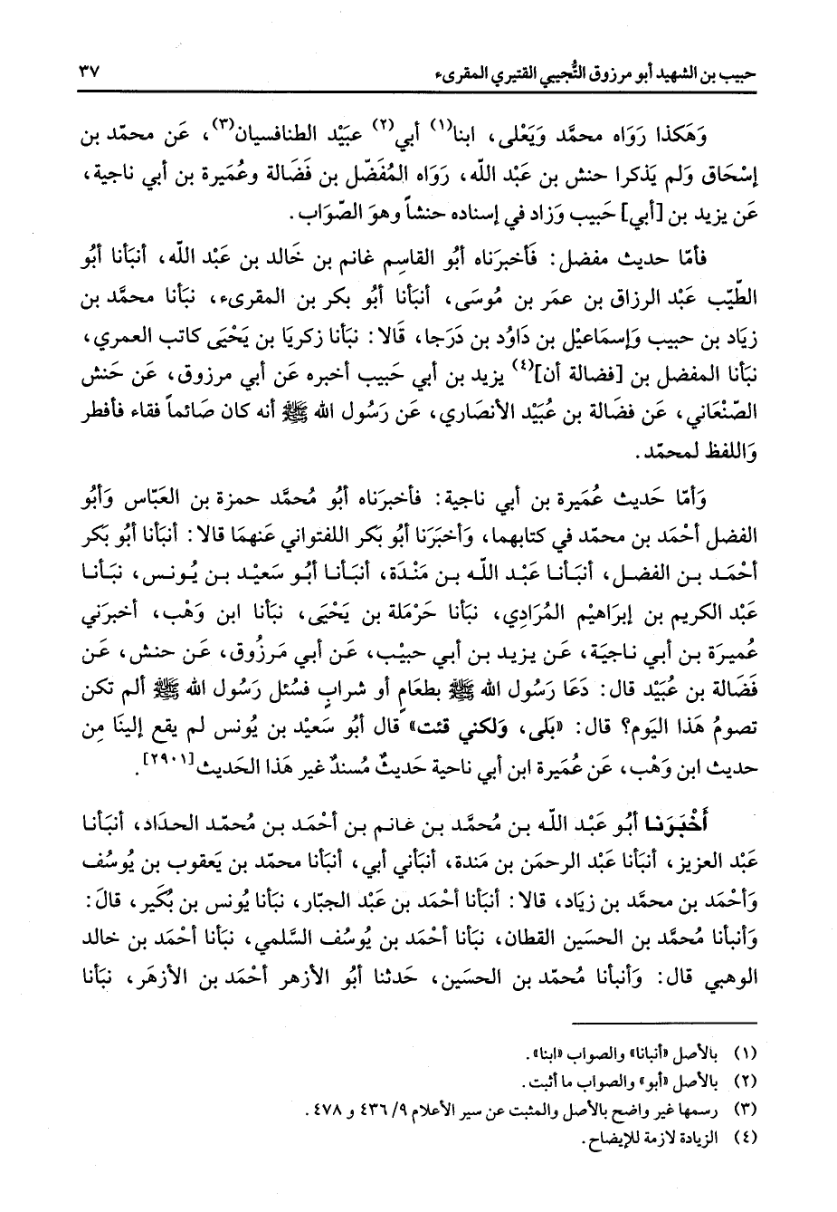 وهكذا رواه محمد ويعلى ابنا (1) أبي (2) عبيد الطنافسيان (3) عن محمد بن إسحاق ولم يذكرا حنش بن عبد الله رواه المفضل بن فضالة وعميرة بن أبي ناجية عن يزيد بن أبي حبيب وزاد في إسناده حنشا وهو الصواب فأما حديث مفضل فأخبرناه أبو القاسم غانم بن خالد بن عبد الله أنبانا أبو الطيب عبد الرزاق بن عمر بن موسى أنبانا أبو بكر بن المقرئ نبأنا محمد بن زياد بن حبيب وإسماعيل بن داود بن درجا قالا نبأنا زكريا بن يحيى كاتب العمري نبأنا المفضل بن فضالة أن (4) يزيد بن أبي حبيب أخبره عن أبي مرزوق عن حنش الصنعاني عن فضالة بن عبيد الأنصاري عن رسول الله (صلى الله عليه وسلم) أنه كان صائما فقاء فأفطر واللفظ لمحمد وأما حديث عميرة بن أبي ناجية فأخبرناه أبو محمد حمزة بن العباس وأبو الفضل أحمد بن محمد في كتابهما وأخبرنا أبو بكر اللفتواني عنهما قالا أنبأنا أبو بكر أحمد بن الفضل أنبأنا عبد الله بن مندة أنبأنا أبو سعيد بن يونس نبأنا عبد الكريم بن إبراهيم المرادي نبأنا حرملة بن يحيى نبأنا ابن وهب أخبرني عميرة بن أبي ناجية عن يزيد بن أبي حبيب عن أبي مرزوق عن حنش عن فضالة بن عبيد قال دعا رسول الله (صلى الله عليه وسلم) بطعام أو شراب فسئل رسول الله (صلى الله عليه وسلم) ألم تكن تصوم هذا اليوم قال بلى ولكني قئت قال أبو سعيد بن يونس لم يقع إلينا من حديث ابن وهب عن عميرة ابن أبي ناجية حديث مسند غير هذا الحديث أخبرنا أبو عبد الله بن محمد بن غانم بن أحمد بن محمد الحداد أنبأنا عبد العزيز أنبأنا عبد الرحمن بن مندة أنبأني أبي أنبأنا محمد بن يعقوب بن يوسف وأحمد بن محمد بن زياد قالا أنبأنا أحمد بن عبد الجبار نبأنا يونس بن بكير قال وأنبأنا محمد بن الحسين القطان نبأنا أحمد بن يوسف السلمي نبأنا أحمد بن خالد الوهبي قال وأنبأنا محمد بن الحسين حدثنا أبو الأزهر أحمد بن الأزهر نبأنا