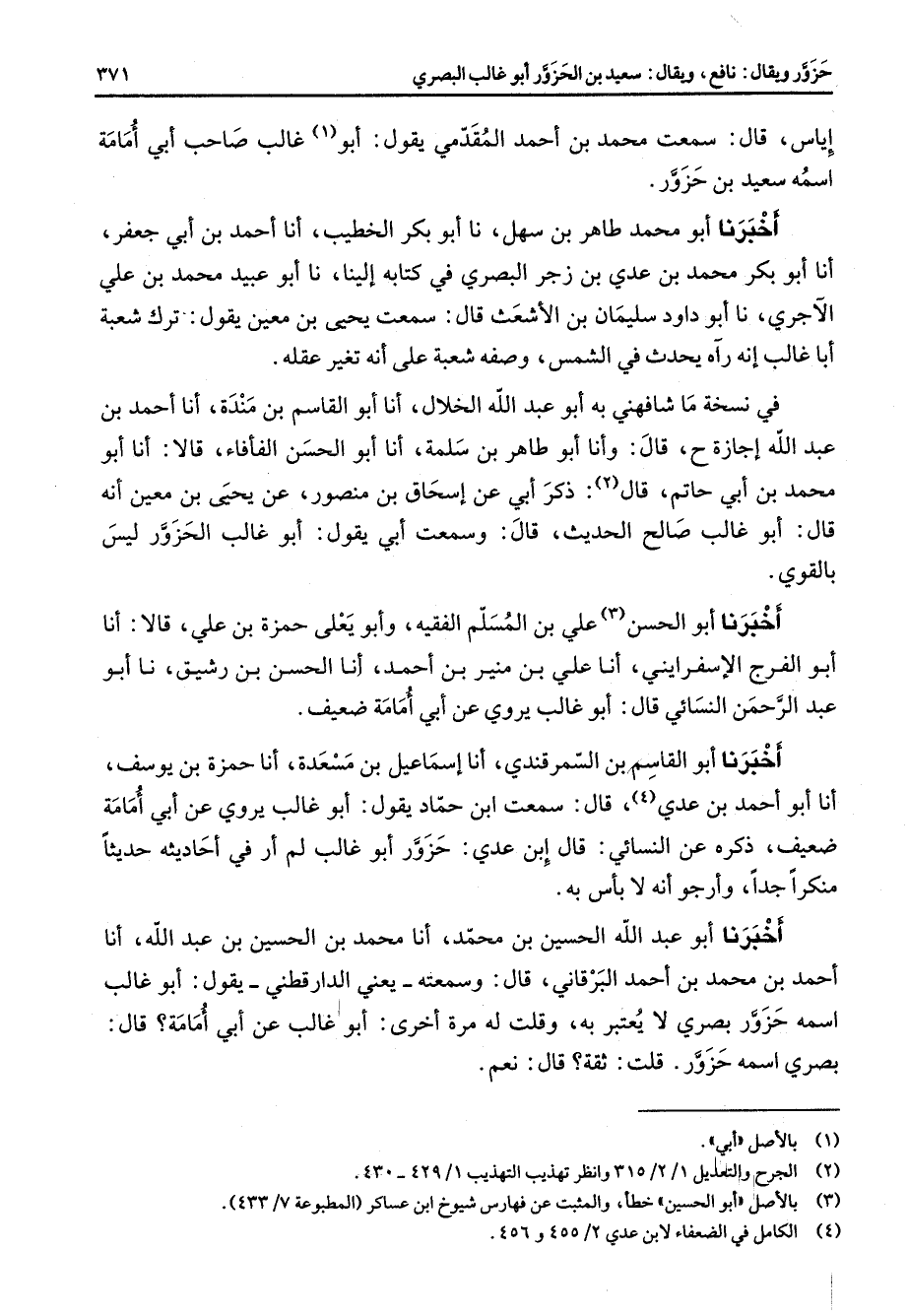 اياس قال سمعت محمد بن احمد المقدمي يقول أبو (1) غالب صاحب أبي امامة اسمه سعيد بن حزور اخبرنا أبو محمد طاهر بن سهل نا أبو بكر الخطيب أنا احمد بن أبي جعفر أنا أبو بكر محمد بن عدي بن زجر البصري في كتابه إلينا نا أبو عبيد محمد بن علي الاجري نا أبو داود سليمان بن الاشعث قال سمعت يحيى بن معين يقول ترك شعبة أبا غالب انه رآه يحدث في الشمس وصفه شعبة على انه تغير عقله في نسخة ما شافهني به أبو عبد الله الخلال أنا أبو القاسم بن مندة أنا احمد بن عبد الله اجازة ح قال وأنا أبو طاهر بن سلمة أنا أبو الحسن الفأفاء قالا أنا أبو محمد بن أبي حاتم قال (2) ذكر أبي عن إسحاق بن منصور عن يحيى بن معين انه قال أبو غالب صالح الحديث قال وسمعت أبي يقول أبو غالب الحزور ليس بالقوي أخبرنا أبو الحسن (3) علي بن المسلم الفقيه وأبو يعلى حمزة بن علي قالا أنا أبو الفرج الاسفرايني أنا علي بن منير بن احمد أنا الحسن بن رشيق نا أبو عبد الرحمن النسائي قال أبو غالب يروي عن أبي امامة ضعيف اخبرنا أبو القاسم بن السمرقندي أنا إسماعيل بن مسعدة أنا حمزة بن يوسف أنا أبو احمد بن عدي (4) قال سمعت ابن حماد يقول أبو غالب يروي عن أبي امامة ضعيف ذكره عن النسائي قال ابن عدي حزور أبو غالب لم ار في أحاديثه حديثا منكرا جدا وارجو انه لا بأس به أخبرنا أبو عبد الله الحسين بن محمد أنا محمد بن الحسين بن عبد الله أنا احمد بن محمد بن احمد البرقاني قال وسمعته يعني الدارقطني يقول أبو غالب اسمه حزور بصري لا يعتبر به وقلت له مرة أخرى أبو غالب عن أبي امامة قال بصري اسمه حزور قلت ثقة قال نعم