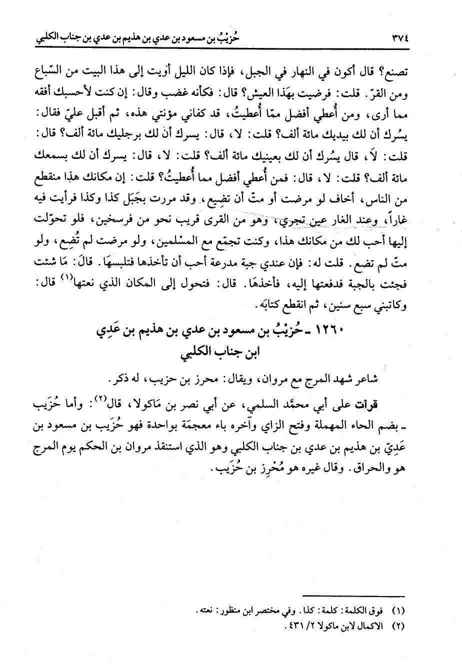 1260 - حزيب بن مسعود بن عدي بن هذيم بن عدي ابن جناب الكلبي شاعر شهد المرج مع مروان ويقال محرز بن حزيب له ذكر قرأت على أبي محمد السلمي عن أبي نصر بن ماكولا قال (2) واما حزيب بضم الحاء المهملة وفتح الزاي وآخره باء معجمة بواحدة فهو حزيب بن مسعود بن عدي بن هذيم بن عدي بن جناب الكلبي وهو الذي استنقذ مروان بن الحكم يوم المرج هو والحراق وقال غيره هو محرز بن حزيب