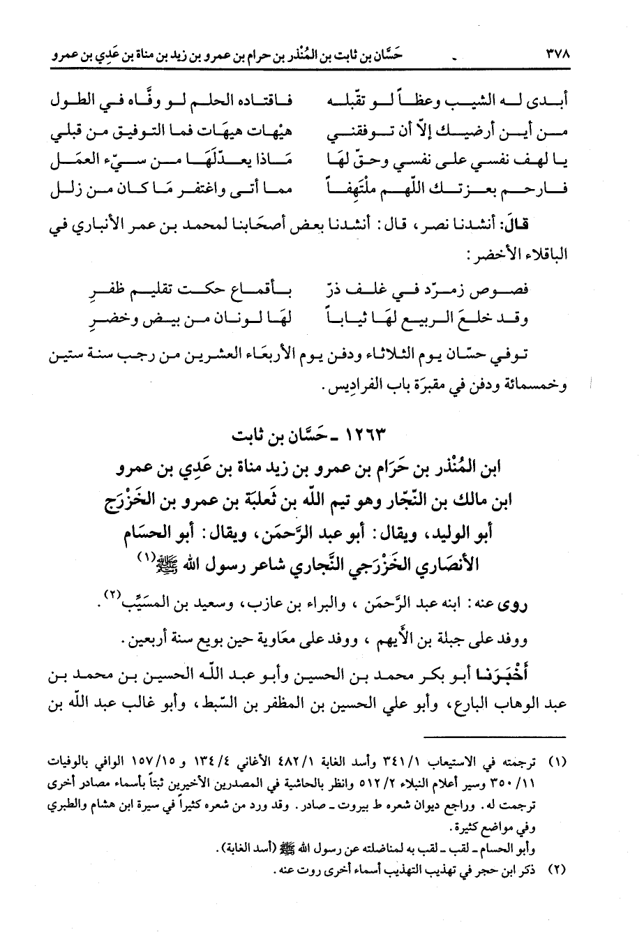 1263 - حسان بن ثابت ابن المنذر بن حرام بن عمرو بن زيد مناة بن عدي بن عمرو ابن مالك بن النجار وهو تيم الله بن ثعلبة بن عمرو بن الخزرج أبو الوليد ويقال أبو عبد الرحمن ويقال أبو الحسام الأنصاري الخزرجي النجاري شاعر رسول الله صلى الله عليه وسلم (1) روى عنه ابنه عبد الرحمن والبراء بن عازب وسعيد بن المسيب (2) ووفد على جبلة بن الايهم ووفد على معاوية حين بويع سنة أربعين أخبرنا أبو بكر محمد بن الحسين وأبو عبد الله الحسين بن محمد بن عبد الوهاب البارع وأبو علي الحسين بن المظفر بن السبط وأبو غالب عبد الله بن