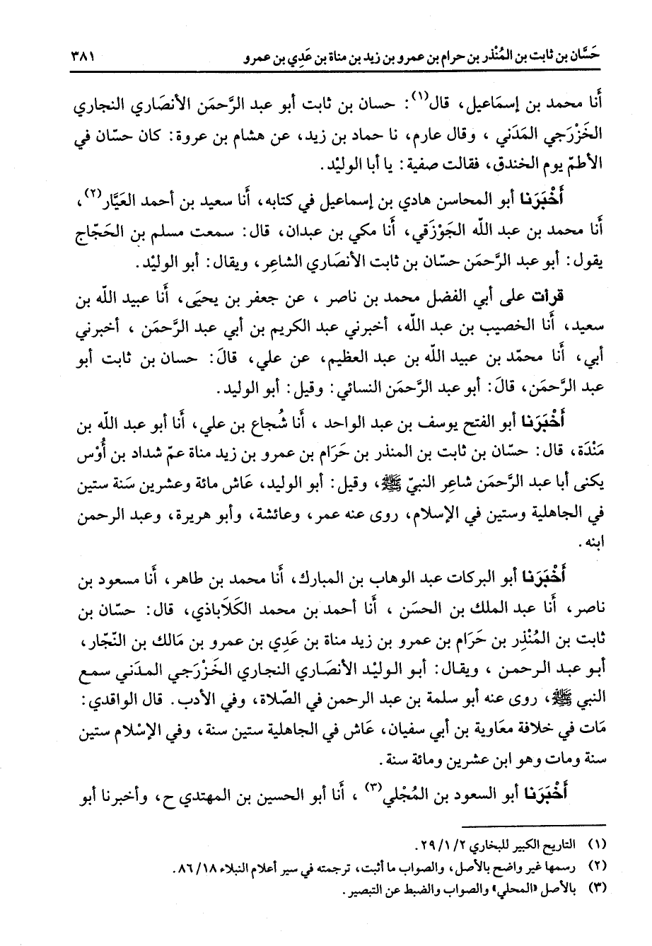 أنا محمد بن إسماعيل قال (1) حسان بن ثابت أبو عبد الرحمن الأنصاري النجاري الخزرجي المدني وقال عارم نا حماد بن زيد عن هشام بن عروة كان حسان في الاطم يوم الخندق فقالت صفية يا أبا الوليد اخبرنا أبو المحاسن هادي بن إسماعيل في كتابه أنا سعيد بن احمد العيار (2) أنا محمد بن عبد الله الجوزقي أنا مكي بن عبدان قال سمعت مسلم بن الحجاج يقول أبو عبد الرحمن حسان بن ثابت الأنصاري الشاعر ويقال أبو الوليد قرأت على أبي الفضل محمد بن ناصر عن جعفر بن يحيى أنا عبيد الله بن سعيد أنا الخصيب بن عبد الله اخبرني عبد الكريم بن أبي عبد الرحمن اخبرني أبي أنا محمد بن عبيد الله بن عبد العظيم عن علي قال حسان بن ثابت أبو عبد الرحمن قال أبو عبد الرحمن النسائي وقيل أبو الوليد اخبرنا أبو الفتح يوسف بن عبد الواحد أنا شجاع بن علي أنا أبو عبد الله بن مندة قال حسان بن ثابت بن المنذر بن حرام بن عمرو بن زيد مناة عم شداد بن اوس يكنى أبا عبد الرحمن شاعر النبي صلى الله عليه وسلم وقيل أبو الوليد عاش مائة وعشرين سنة ستين في الجاهلية وستين في الإسلام روى عنه عمر وعائشة وأبو هريرة وعبد الرحمن ابنه اخبرنا أبو البركات عبد الوهاب بن المبارك أنا محمد بن طاهر أنا مسعود بن ناصر أنا عبد الملك بن الحسن أنا احمد بن محمد الكلاباذي قال حسان بن ثابت بن المنذر بن حرام بن عمرو بن زيد مناة بن عدي بن عمرو بن مالك بن النجار أبو عبد الرحمن ويقال أبو الوليد الأنصاري النجاري الخزرجي المدني سمع النبي صلى الله عليه وسلم روى عنه أبو سلمة بن عبد الرحمن في الصلاة وفي الأدب قال الواقدي مات في خلافة معاوية بن أبي سفيان عاش في الجاهلية ستين سنة وفي الإسلام ستين سنة ومات وهو ابن عشرين ومائة سنة اخبرنا أبو السعود بن المجلي (3) أنا أبو الحسين بن المهتدي ح واخبرنا أبو