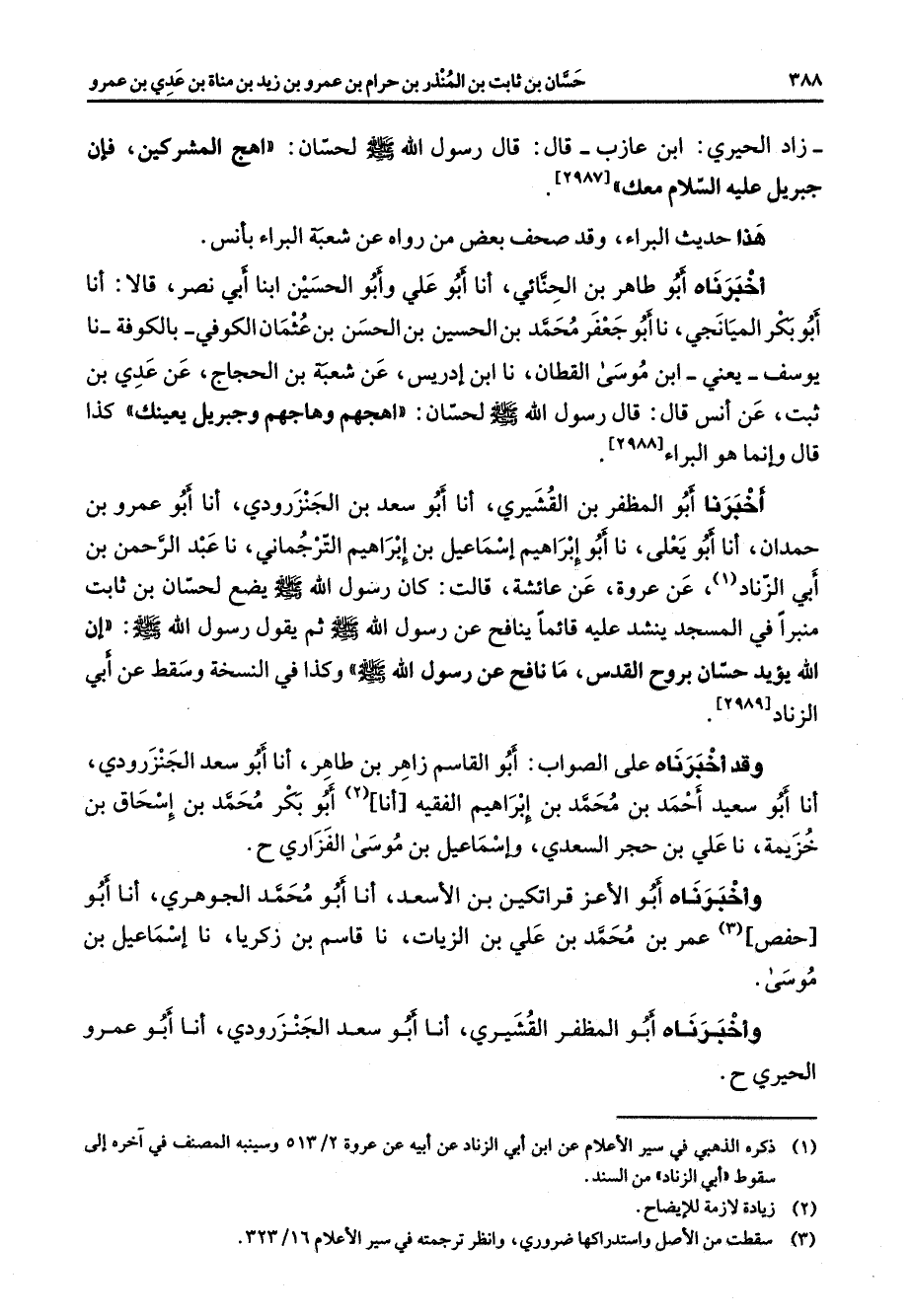 [2988] اخبرنا أبو المظفر بن القشيري أنا أبو سعد بن الجنزرودي أنا أبو عمرو بن حمدان أنا أبو يعلي نا أبو إبراهيم إسماعيل بن إبراهيم الترجماني نا عبد الرحمن بن أبي الزناد (1) عن عروة عن عائشة قالت كان رسول الله صلى الله عليه وسلم يضح لحسان بن ثابت منبرا في المسجد ينشد عليه قائما ينافح عن رسول الله صلى الله عليه وسلم ثم يقول رسول الله صلى الله عليه وسلم أن الله يؤيد حسان بروح القدس ما نافح عن رسول الله (صلى الله عليه وسلم) وكذا في النسخة وسقط عن أبي الزناد وقد اخبرناه على الصواب أبو القاسم زاهر بن طاهر أنا أبو سعد الجنزرودي أنا أبو سعيد احمد بن محمد بن إبراهيم الفقيه أنا (2) أبو بكر محمد بن إسحاق بن خزيمة نا علي بن حجر السعدي واسماعيل بن موسى الفزاري ح واخبرناه أبو الاعز قراتكين بن الاسعد أنا أبو محمد الجوهري أنا أبو حفص (3) عمر بن محمد بن علي بن الزيات نا قاسم بن زكريا نا إسماعيل بن موسى واخبرناه أبو المظفر القشيري أنا أبو سعد الجنزرودي أنا أبو عمرو الحيري ح