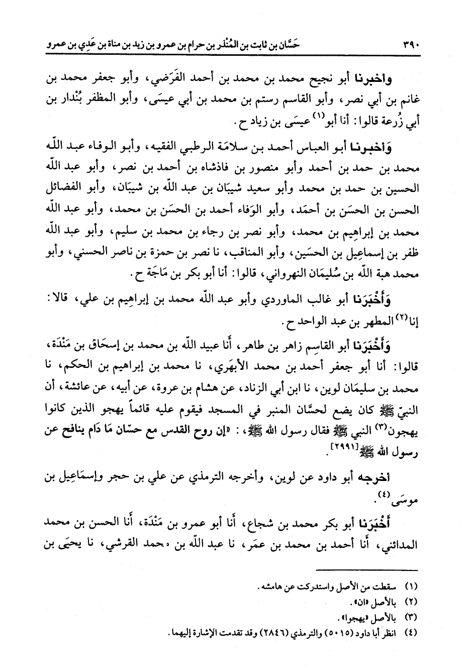 واخبرنا أبو نجيح محمد بن محمد بن احمد الفرضي وأبو جعفر محمد بن غانم بن أبي نصر وأبو القاسم رستم بن محمد بن أبي عيسى وأبو المظفر بندار بن أبي زرعة قالوا أنا أبو (1) عيسى بن زياد ح واخبرنا أبو العباس احمد بن سلامة الرطبي الفقيه وأبو الوفاء عبد الله محمد بن حمد بن احمد وأبو منصور بن فاذشاه بن احمد بن نصر وأبو عبد الله الحسين بن حمد بن محمد وأبو سعيد شيبان بن عبد الله بن شيبان وأبو الفضائل الحسن بن الحسن بن احمد وأبو الوفاء احمد بن الحسن بن محمد وأبو عبد الله محمد بن إبراهيم بن محمد وأبو نصر بن رجاء بن محمد بن سليم وأبو عبد الله ظفر بن إسماعيل بن الحسين وأبو المناقب نا نصر بن حمزة بن ناصر الحسني وأبو محمد هبة الله بن سليمان النهرواني قالوا أنا أبو بكر بن ماجة ح واخبرنا أبو غالب الماوردي وأبو عبد الله محمد بن إبراهيم بن علي قالا أنا (2) المطهر بن عبد الواحد ح واخبرنا أبو القاسم زاهر بن طاهر أنا عبيد الله بن محمد بن إسحاق بن مندة قالوا أنا أبو جعفر احمد بن محمد الابهري نا محمد بن إبراهيم بن الحكم نا محمد بن سليمان لوين نا ابن أبي الزناد عن هشام بن عروة عن أبيه عن عائشة أن النبي صلى الله عليه وسلم كان يضع لحسان المنبر في المسجد فيقوم عليه قائما يهجو الذين كانوا يهجون (3) النبي (صلى الله عليه وسلم) فقال رسول الله (صلى الله عليه وسلم) أن روح القدس مع حسان ما دام ينافح عن رسول الله صلى الله عليه وسلم