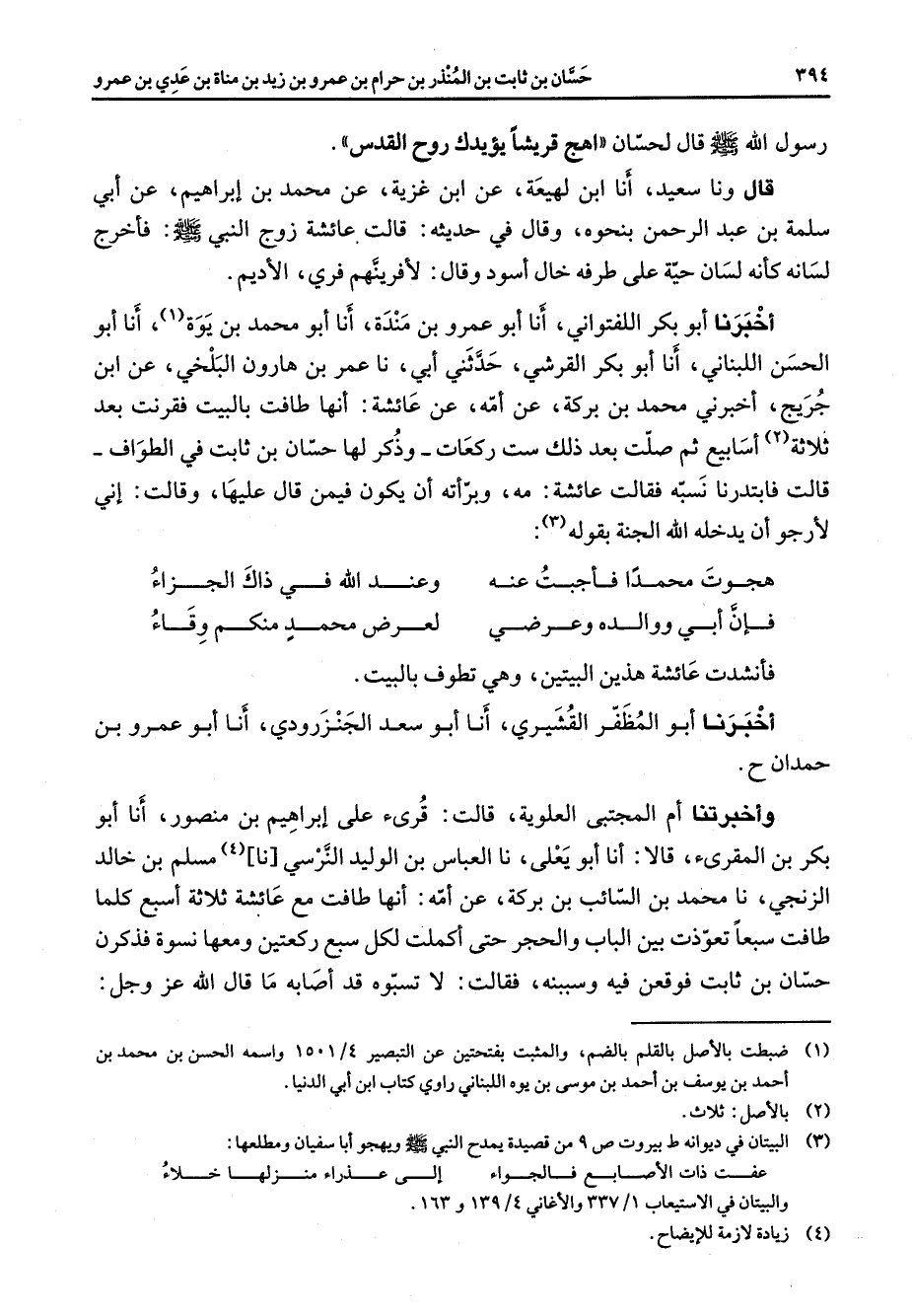 رسول الله صلى الله عليه وسلم قال لحسان اهج قريشا يؤيدك روح القدس قال ونا سعيد أنا ابن لهيعة عن ابن غزية عن محمد بن إبراهيم عن أبي سلمة بن عبد الرحمن بنحوه وقال في حديثه قالت عائشة زوج النبي صلى الله عليه وسلم فأخرج لسانه كأنه لسان حية على طرفه خال اسود وقال لافرينهم فري الاديم اخبرنا أبو بكر اللفتواني أنا أبو عمرو بن مندة أنا أبو محمد بن يوة (1) أنا أبو الحسن اللبناني أنا أبو بكر القرشي حدثني أبي نا عمر بن هارون البلخي عن ابن جريج اخبرني محمد بن بركة عن امه عن عائشة إنها طافت بالبيت فقرنت بعد ثلاثة (2) اسابيع ثم صلت بعد ذلك ست ركعات وذكر لها حسان بن ثابت في الطواف قالت فابتدرنا نسبه فقالت عائشة مه وبرأته أن يكون فيمن قال عليها وقالت أني لارجو أن يدخله الله الجنة بقوله (3) * هجوت محمدا فأجبت عنه * وعند الله في ذاك الجزاء فإن أبي ووالده وعرضي * لعرض محمد منكم وقاء * فأنشدت عائشة هذين البيتين وهي تطوف بالبيت اخبرنا أبو المظفر القشيري أنا أبو سعد الجنزرودي أنا أبو عمرو بن حمدان ح واخبرتنا أم المجتبى العلوية قالت قرئ على إبراهيم بن منصور أنا أبو بكر بن المقرئ قالا أنا أبو يعلي نا العباس بن الوليد النرسي نا (4) مسلم بن خالد الزنجي نا محمد بن السائب بن بركة عن امه إنها طافت مع عائشة ثلاثة اسبع كلما طافت سبعا تعوذت بين الباب والحجر حتى اكملت لكل سبع ركعتين ومعها نسوة فذكرن حسان بن ثابت فوقعن فيه وسببنه فقالت لا تسبوه قد أصابه ما قال الله عز وجل