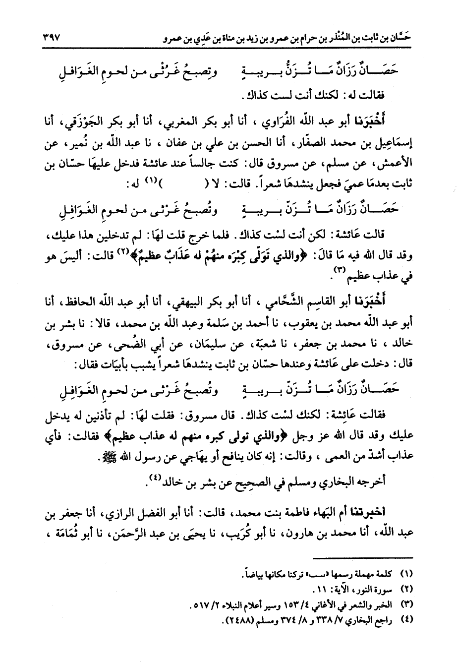 اخبرنا أبو القاسم الشحامي أنا أبو بكر البيهقي أنا أبو عبد الله الحافظ أنا أبو عبد الله محمد بن يعقوب نا احمد بن سلمة وعبد الله بن محمد قالا نا بشر بن خالد نا محمد بن جعفر نا شعبة عن سليمان عن أبي الضحى عن مسروق قال دخلت على عائشة وعندها حسان بن ثابت ينشدها شعرا يشبب بأبيات فقال * حصان رزان ما تزن بريبة * وتصبح غرثى من لحوم الغوافل * فقالت عائشة لكنك لست كذاك قال مسروق فقلت لها لم تأذنين له يدخل عليك وقد قال الله عز وجل " والذي تولى كبره منهم له عذاب عظيم " فقالت فأي عذاب اشد من العمى وقالت انه كان ينافح أو يهاجي عن رسول الله صلى الله عليه وسلم اخرجه البخاري ومسلم في الصحيح عن بشر بن خالد (4) اخبرتنا أم البهاء فاطمة بنت محمد قالت انا أبو الفضل الرازي أنا جعفر بن عبد الله أنا محمد بن هارون نا أبو كريب نا يحيى بن عبد الرحمن نا أبو ثمامة