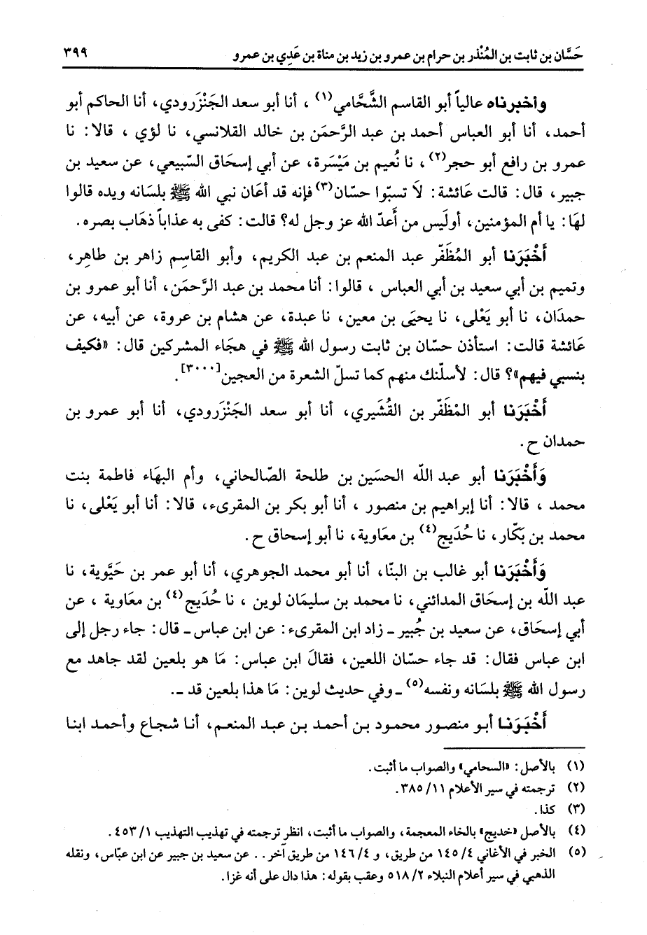 واخبرناه عاليا أبو القاسم الشحامي (1) أنا أبو سعد الجنزرودي أنا الحاكم أبو احمد أنا أبو العباس احمد بن عبد الرحمن بن خالد القلانسي نا لؤي قالا نا عمرو بن رافع أبو حجر (2) نا نعيم بن ميسرة عن أبي إسحاق السبيعي عن سعيد بن جبير قال قالت عائشة لا تسبوا حسان (3) فإنه قد أعان نبي الله صلى الله عليه وسلم بلسانه ويده قالوا لها يا أم المؤمنين اوليس من اعد الله عز وجل له قالت كفى به عذابا ذهاب بصره اخبرنا أبو المظفر عبد المنعم بن عبد الكريم وأبو القاسم زاهر بن طاهر وتميم بن أبي سعيد بن أبي العباس قالوا أنا محمد بن عبد الرحمن أنا أبو عمرو بن حمدان نا أبو يعلى نا يحيى بن معين نا عبدة عن هشام بن عروة عن أبيه عن عائشة قالت استأذن حسان بن ثابت رسول الله صلى الله عليه وسلم في هجاء المشركين قال فكيف بنسبي فيهم قال لأسلنك منهم كما تسل الشعرة من العجين ح اخبرنا أبو المظفر بن القشيري أنا أبو سعد الجنزرودي أنا أبو عمرو بن حمدان ح واخبرنا أبو عبد الله الحسين بن طلحة الصالحاني وام البهاء فاطمة بنت محمد قالا انا إبراهيم بن منصور أنا أبو بكر بن المقرئ قالا أنا أبو يعلي نا محمد بن بكار نا حديج (4) بن معاوية نا أبو إسحاق ح واخبرنا أبو غالب بن البنا أنا أبو محمد الجوهري أنا أبو عمر بن حيوية نا عبد الله بن إسحاق المدائني نا محمد بن سليمان لوين نا حديج (4) بن معاوية عن أبي إسحاق عن سعيد بن جبير زاد ابن المقرئ عن ابن عباس قال جاء رجل إلى ابن عباس فقال قد جاء حسان اللعين فقال ابن عباس ما هو بلعين لقد جاهد مع رسول الله صلى الله عليه وسلم لسانه ونفسه (5) وفي حديث لوين ما هذا بلعين قد اخبرنا أبو منصور محمود بن احمد بن عبد المنعم أنا شجاع واحمد ابنا