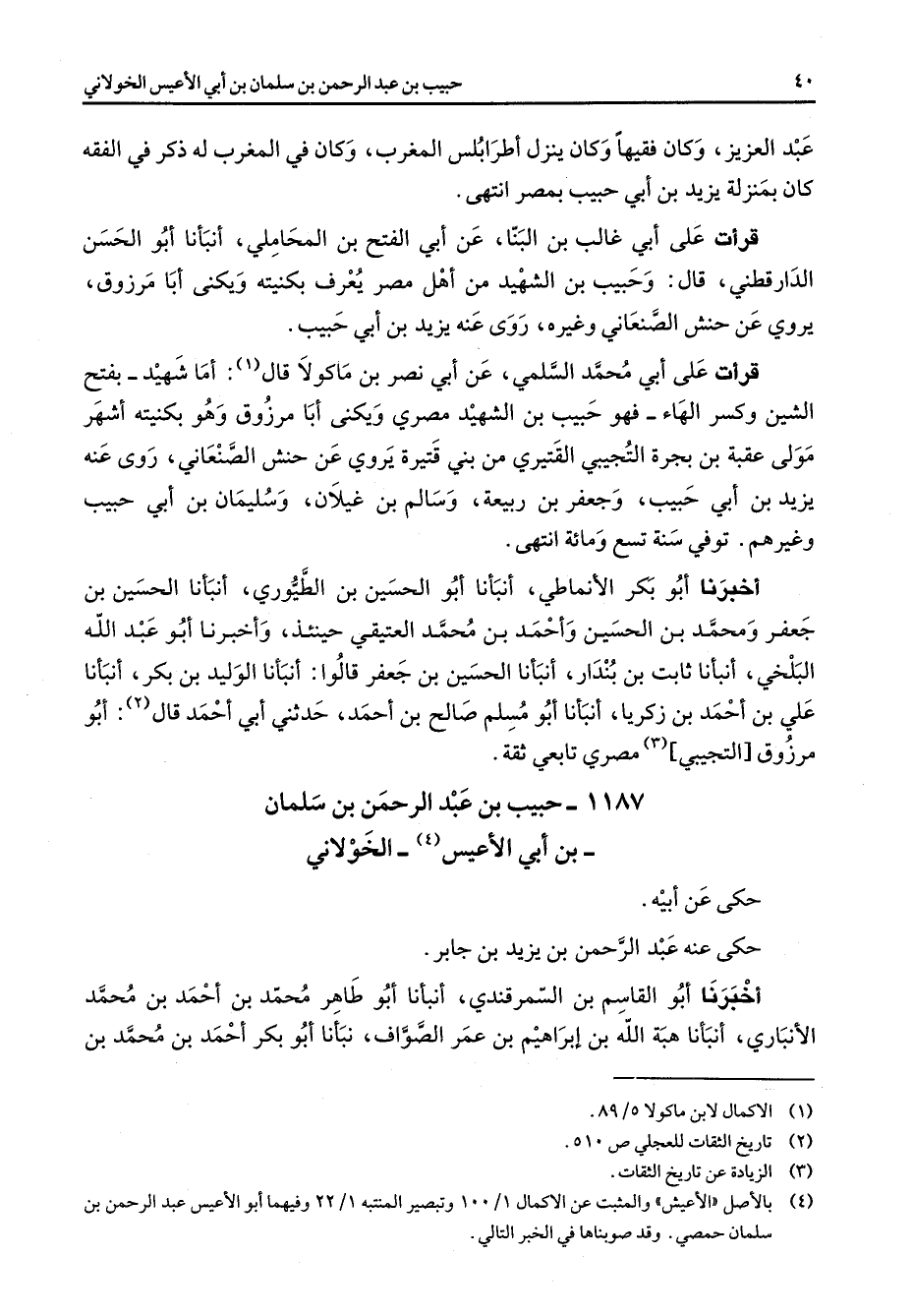 1187 - حبيب بن عبد الرحمن بن سلمان بن أبي الأعيس (4) الخولاني حكى عن أبيه حكى عنه عبد الرحمن بن يزيد بن جابر أخبرنا أبو القاسم بن السمرقندي أنبأنا أبو طاهر محمد بن أحمد بن محمد الأنباري أنبأنا هبة الله بن إبراهيم بن عمر الصواف نبأنا أبو بكر أحمد بن محمد بن (1) الاكمال لابن ماكولا 5 / 89