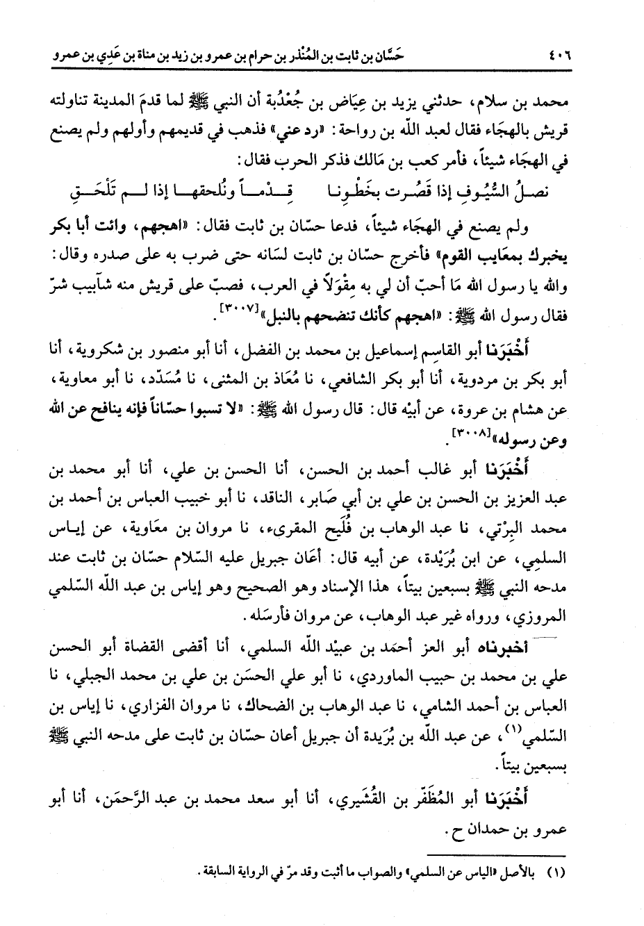 [3008] اخبرنا أبو غالب احمد بن الحسن أنا الحسن بن علي أنا أبو محمد بن عبد العزيز بن الحسن بن علي بن أبي صابر الناقد نا أبو خبيب العباس بن احمد بن محمد البرتي نا عبد الوهاب بن فليح المقرئ نا مروان بن معاوية عن اياس السلمي عن ابن بريدة عن أبيه قال اعان جبريل عليه السلام حسان بن ثابت عند مدحه النبي صلى الله عليه وسلم بسبعين بيتا هذا الاسناد وهو الصحيح وهو اياس بن عبد الله السلمي المروزي ورواه غير عبد الوهاب عن مروان فأرسله اخبرناه أبو العز احمد بن عبيد الله السلمي أنا اقضي القضاة أبو الحسن علي بن محمد بن حبيب الماوردي نا أبو علي الحسن بن علي بن محمد الجبلي نا العباس بن احمد الشامي نا عبد الوهاب بن الضحاك نا مروان الفزاري نا اياس بن السلمي (1) عن عبد الله بن بريدة أن جبريل اعان حسان بن ثابت على مدحه النبي صلى الله عليه وسلم بسبعين بيتا اخبرنا أبو المظفر بن القشيري أنا أبو سعد محمد بن عبد الرحمن أنا عمرو بن حمدان ح