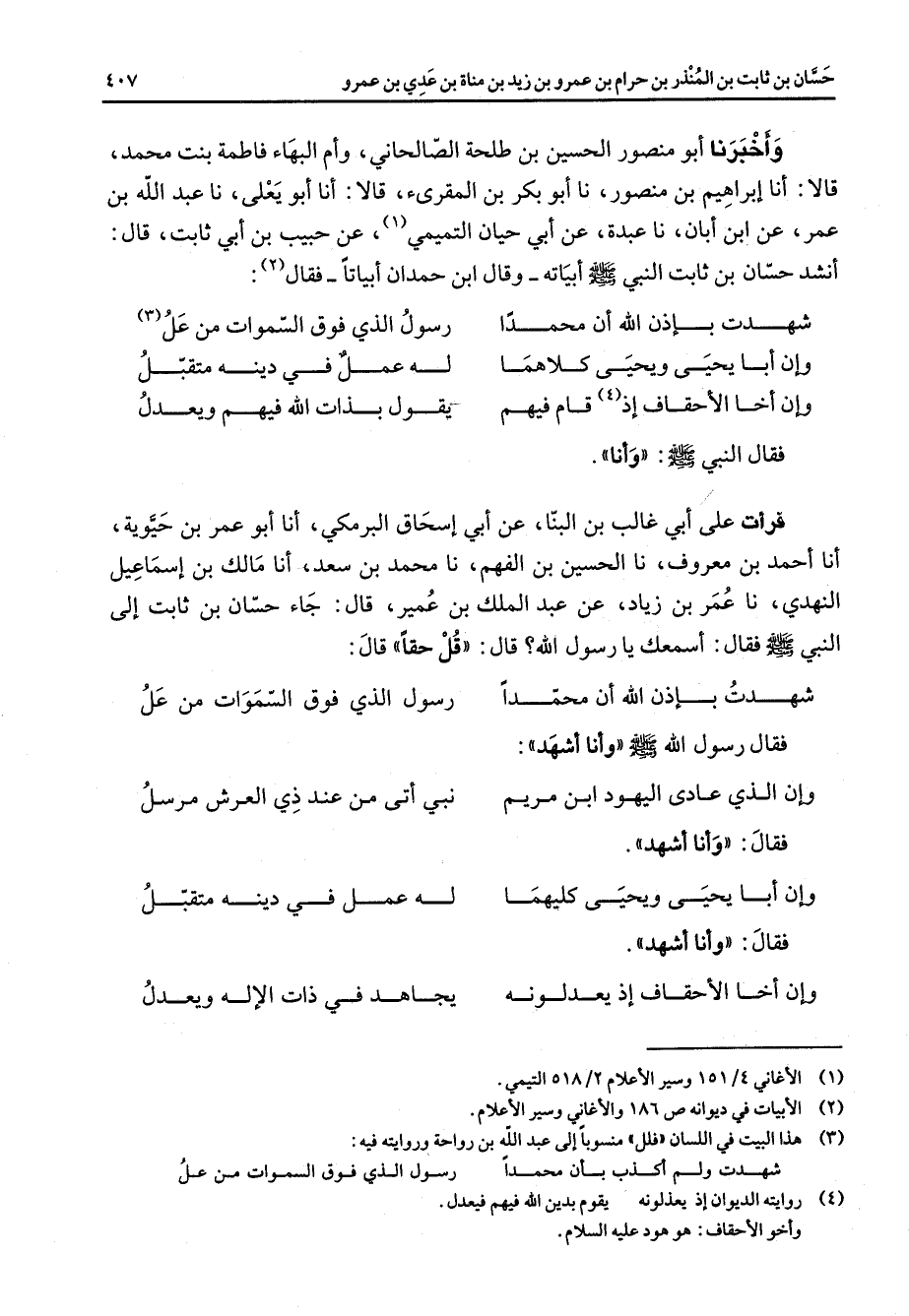 واخبرنا أبو منصور الحسين بن طلحة الصالحاني وام البهاء فاطمة بنت محمد قالا أنا إبراهيم بن منصور نا أبو بكر بن المقرئ قالا أنا أبو يعلي نا عبد الله بن عمر عن ابن ابان نا عبدة عن أبي حيان التميمي (1) عن حبيب بن أبي ثابت قال انشد حسان بن ثابت النبي صلى الله عليه وسلم ابياته وقال ابن حمدان ابياتا فقال (2) * شهدت بإذن الله أن محمدا * رسول الذي فوق السموات من عل (3) وان أبا يحيى ويحيى كلاهما * له عمل في دينه متقبل وان اخا الاحقاف إذ (4) قام فيهم * يقول بذات الله فيهم ويعدل * فقال النبي صلى الله عليه وسلم وأنا قرأت على أبي غالب بن البنا عن أبي اسحاق البرمكي أنا أبو عمر بن حيوية أنا احمد بن معروف نا الحيسن بن الفهم نا محمد بن سعد أنا مالك بن إسماعيل النهدي نا عمر بن زياد عن عبد الملك بن عمير قال جاء حسان بن ثابت إلى النبي صلى الله عليه وسلم فقال اسمعك يا رسول الله قال قل حقا قال * شهدت بإذن الله أن محمدا * رسول الذي فوق السموات من عل * فقال رسول الله صلى الله عليه وسلم وأنا أشهد * وان الذي عادى اليهود ابن مريم * نبي أتى من عند ذي العرش مرسل * فقال وأنا أشهد * وان اخا الاحقاف إذ يعدلونه * يجاهد في ذات الله ويعدل *
