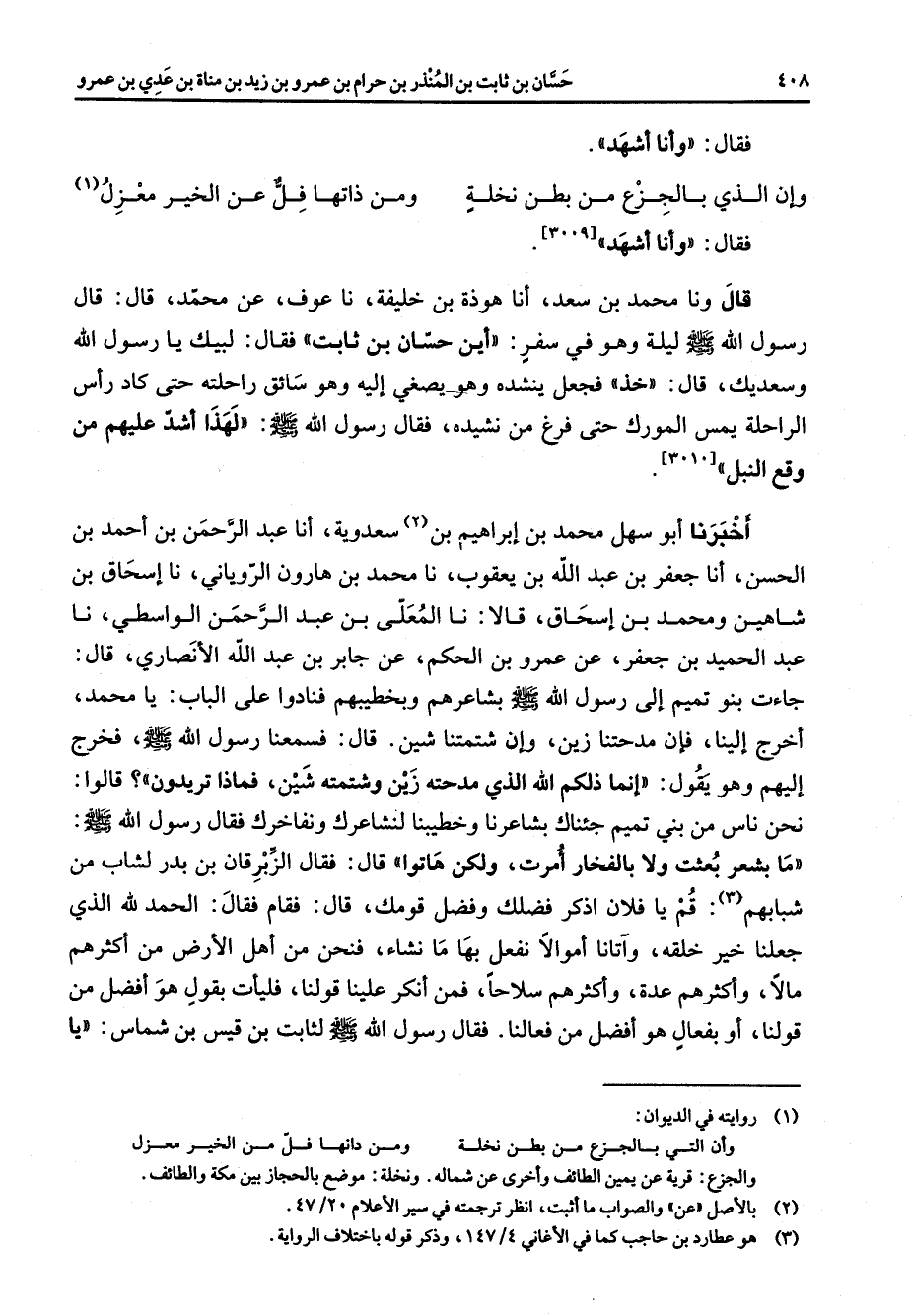 فقال وأنا أشهد * وان الذي بالجزع من بطن نخلة * ومن ذاتها فل عن الخير معزل (1) فقال وأنا أشهد قال ونا محمد بن سعد أنا هوذة بن خليفة نا عوف عن محمد قال قال رسول الله صلى الله عليه وسلم ليلة وهو في سفر اين حسان بن ثابت فقال لبيك يا رسول الله وسعديك قال خذ فجعل ينشده وهو يصغي إليه وهو سائق راحلته حتى كان رأس الراحلة يمس المورك حتى فرغ من نشيده فقال رسول الله صلى الله عليه وسلم لهذا اشد عليهم من وقع النبل