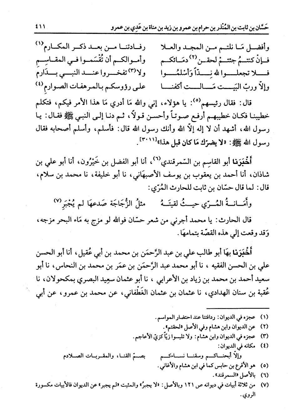 [3011] اخبرنا أبو القاسم بن السمرقندي (6) أنا أبو الفضل بن خيرون أنا أبو علي بن شاذان أنا احمد بن يعقوب بن يوسف الاصبهاني نا أبو خليفة نا محمد بن سلام قال لما قال حسان بن ثابت للحارث المري * وأمانة المري حيث لقيته * مثل الزجاجة صدعها لم يجبر * (7) قال الحارث يا محمد اجرني من شعر حسان فوالله لو مزج به ماء البحر مزجه وقد وقعت الي هذه القصة بتمامها اخبرنا بها أبو طالب علي بن عبد الرحمن بن محمد بن أبي عقيل أنا أبو الحسن علي بن الحسن الفقيه نا أبو محمد عبد الرحمن بن عمر بن محمد بن النحاس نا أبو سعيد احمد بن محمد بن زياد بن الأعرابي نا أبو عثمان سعيد البصري بمكحولان نا عقبة بن سنان الهدادي نا عثمان بن عثمان الغطفاني عن محمد بن عمرو عن أبي