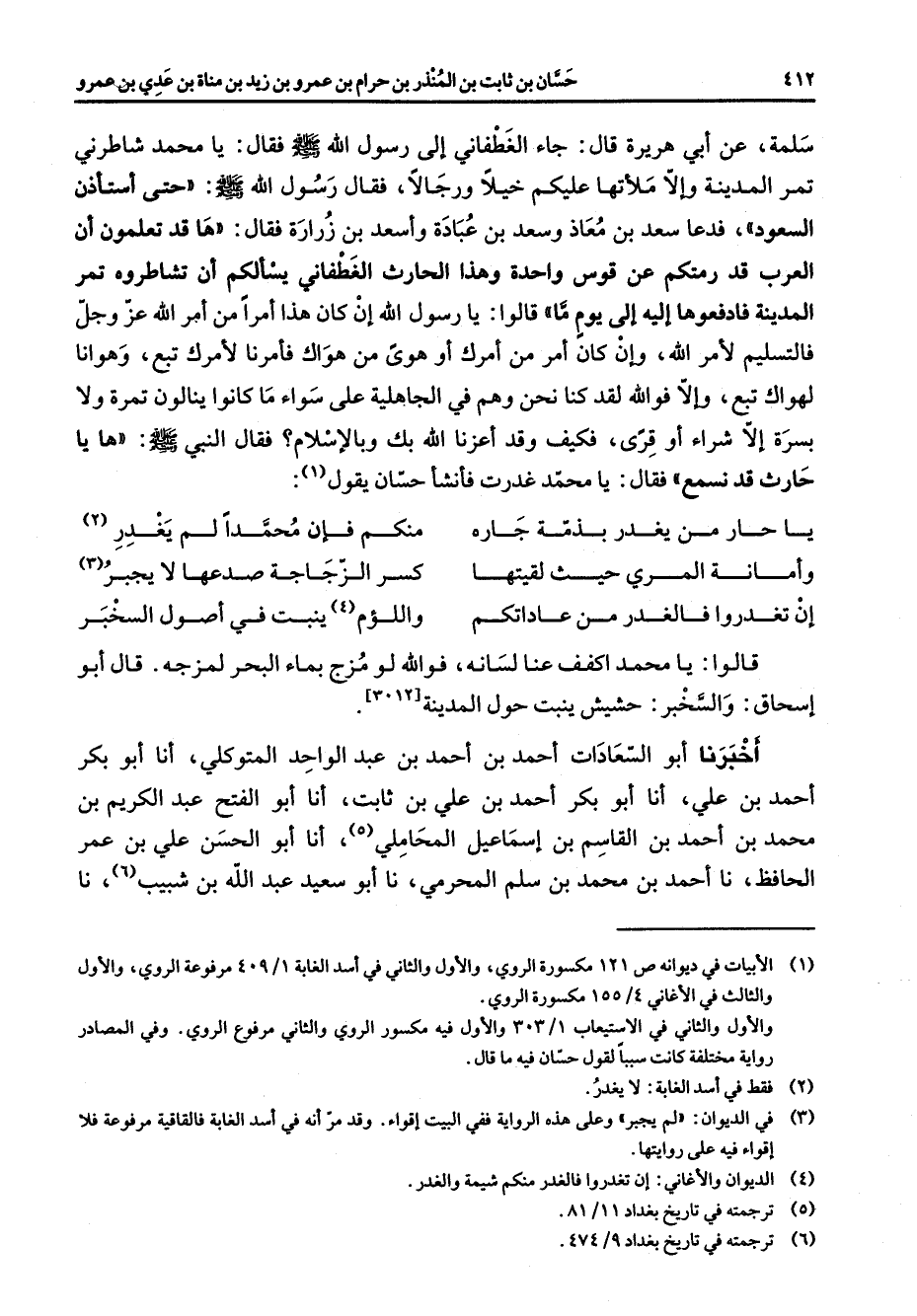 سلمة عن أبي هريرة قال جاء الغطفاني إلى رسول الله صلى الله عليه وسلم فقال يا محمد شاطرني تمر المدينة وإلا ملأتها عليكم خيلا ورجالا فقال رسول الله صلى الله عليه وسلم حتى استأذن السعود فدعا سعد بن معاذ وسعد بن عبادة وأسعد بن زرارة فقال ها قد تعلمون أن العرب قد رمتكم عن قوس واحدة وهذا الحارث الغطفاني يسألكم أن تشاطروه تمر المدينة فادفعوها إليه إلى يوم ما قالوا يا رسول الله أن كان هذا امرا من أمر الله عز وجل فالتسليم لامر الله وان كان أمر من امرك أو هوى من هواك فأمرنا لأمرك تبع وهوانا لهواك تبع وإلا فوالله لقد كنا نحن وهم في الجاهلية على سواء ما كانوا ينالون تمرة ولا بسرة إلا شراء أو قرى فكيف وقد اعزنا الله بك وبالاسلام فقال النبي صلى الله عليه وسلم ها يا حارث قد نسمع فقال يا محمد غدرت فأنشأ حسان يقول (1) : يا حار من يغدر بذمة جاره * منكم فإن محمدا لم يغدر (2) وأمانة المري حيث لقيتها * كسر الزجاجة صدعها لا يجبر (3) أن تغدروا فالغدر من عاداتكم * واللؤم (4) ينبت في اصول السخبر * قالوا يا محمد اكفف عنا لسانه فوالله لو مزج بماء البحر لمزجه قال أبو إسحاق والسخبر حشيش ينبت حول المدينة