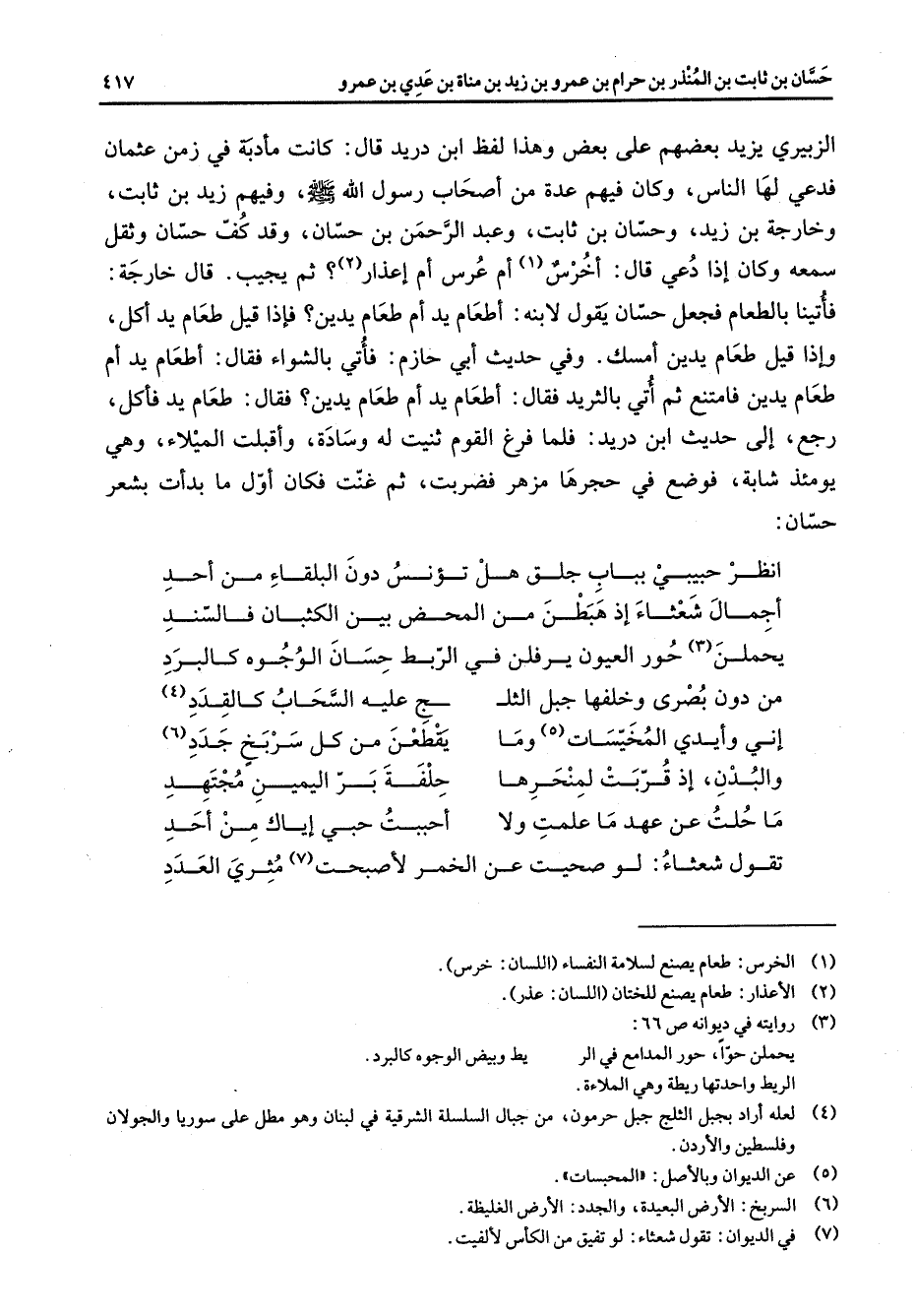 الزبيري يزيد بعضهم على بعض وهذا لفظ ابن دريد قال كانت مأدبة في زمن عثما فدعي لها الناس وكان فيهم عدة من أصحاب رسول الله صلى الله عليه وسلم وفيهم زيد بن ثابت وخارجة بن زيد وحسان بن ثابت وعبد الرحمن بن حسان وقد كف حسان وثقل سمعه وكان إذا دعي قال اخرس (1) أم عرس أم اعذار (2) ثم يجيب قال خارجة فأتينا بالطعام فجعل حسان يقول لابنه اطعام يد أم طعام يدين فإذا قيل طعام يد أكل وإذا قيل طعام يدين امسك وفي حديث أبي حازم فأتي بالشواء فقال اطعام يد أم طعام يدين فامتنع ثم اتي بالثريد فقال اطعام يد أم طعام يدين فقال طعام يد فأكل رجع إلى حديث ابن دريد فلما فرغ القوم ثنيت له وسادة واقبلت الميلاء وهي يومئذ شابة فوضع في حجرها مزهر فضربت ثم غنت فكان أول ما بدأت بشعر حسان * انظر حبيبي بباب جلق هل تؤنس دون البلقاء من أحد * اجمال شعثاء إذ هبطن من المحض بين الكثبان فالسند * يحملن (3) حور العيون يرفلن في الربط حسان الوجوه كالبرد * من دون بصرى وخلفها جبل الثل * ج عليه السحاب كالقدد (4) أني وايدي المخيسات (5) وما * يقطعن من كل سربخ جدد (6) والبدن إذ قربت لمنحرها * حلفة بر اليمين مجتهد ما حلت عن عهد ما علمت ولا * احببت حبي اياك من أحد تقول شعثاء لو صحيت عن الخمر لأصبحت (7) مثري العدد *