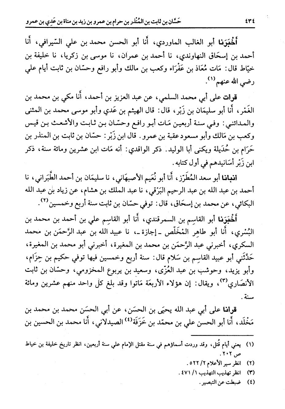 اخبرنا ابوم القاسم بن السمرقندي أنا أبو القاسم علي بن احمد بن محمد بن البسري أنا أبو طاهر المخلص اجازة نا عبيد الله بن عبد الرحمن بن محمد السكري اخبرني عبد الرحمن بن محمد بن المغيرة اخبرني أبو محمد بن المغيرة حدثني أبو عبيد القاسم بن سلام قال سنة أربع وخمسين فيها توفي حكيم بن حزام وأبو يزيد وحوشب بن عبد العزى وسعيد بن يربوع المخزومي وحسان بن ثابت الأنصاري (3) ويقال أن هؤلاء الأربعة ماتوا وقد بلغ كل واحد منهم عشرين ومائة سنة قرأنا على أبي عبد الله يحيى بن الحسن عن أبي الحسن محمد بن محمد بن مخلد أنا أبو الحسن علي بن محمد بن خزفة (4) الصيدلاني أنا محمد بن الحسين بن