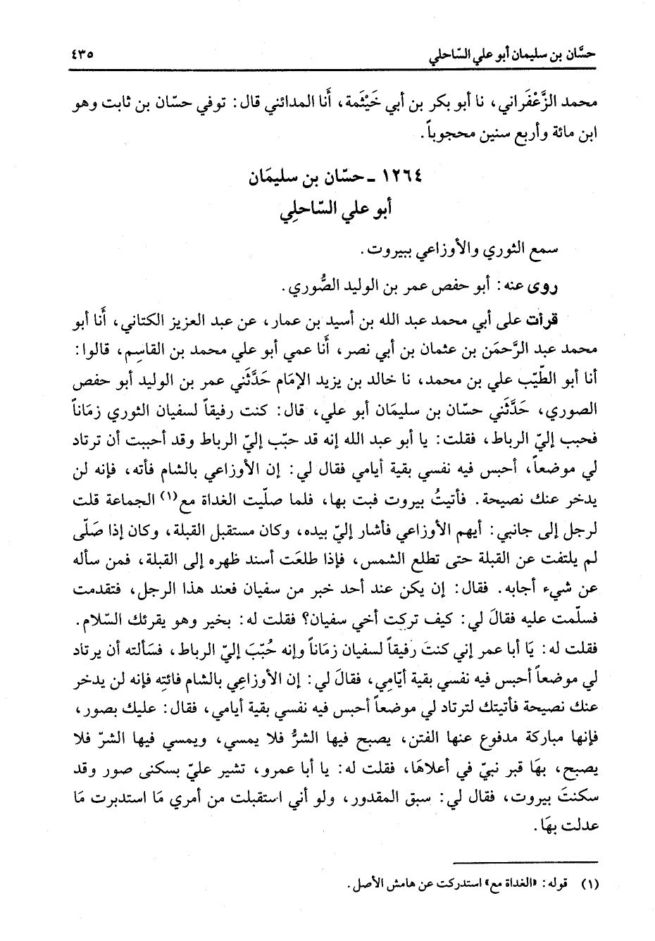 1264 - حسان بن سليمان أبو علي الساحلي سمع الثوري والاوزاعي ببيروت روى عنه أبو حفص عمر بن الوليد الصوري قرأت على أبي محمد عبد الله بن اسيد بن عمار عن عبد العزيز الكتاني أنا أبو محمد عبد الرحمن بن عثمان بن أبي نصر أنا عمي أبو علي محمد بن القاسم قالوا أنا أبو الطيب علي بن محمد نا خالد بن يزيد الأمام حدثني عمر بن الوليد أبو حفص الصوري حدثني حسان بن سليمان أبو علي قال كنت رفيقا لسفيان الثوري زمانا فحبب الي الرباط فقلت يا أبو عبد الله انه قد حبب الي الرباط وقد احببت أن ترتاد لي موضعا احبس فيه نفسي بقية ايامي فقال لي أن الاوزاعي بالشام فأته فإنه لن يدخر عنك نصيحة فأتيت بيروت فبت بها فلما صليت الغداة مع (1) الجماعة قلت لرجل إلى جانبي ايهم الاوزاعي فأشار الي بيده وكان مستقبل القبلة وكان إذا صلى لم يلتفت عن القبلة حتى تطلع الشمس فإذا طلعت اسند ظهره إلى القبلة فمن سأله عن شئ أجابه فقال إن يكن عند أحد خبر من سفيان فعند هذا الرجل فتقدمت فسلمت عليه فقال لي كيف تركت اخي سفيان فقلت له بخير وهو يقرئك السلام فقلت له يا أبا عمر أني كنت رفيقا لسفيان زمانا وانه حبب الي الرباط فسألته أن يرتاد لي موضعا احبس فيه نفسي بقية ايامي فقال لي إن الأوزاعي بالشام فائته فإنه لن يدخر عنك نصيحة فأتيتك لترتاد لي موضعا أحبس فيه نفسي بقية أيامي فقال عليك بصور فإنها مباركة مدفوع عنها الفتن يصبح فيها الشر فلا يمسي ويمسي فيها الشر فلا يصبح بها قبر نبي في اعلاها فقلت له يا أبا عمرو تشير علي بسكنى صور وقد سكنت بيروت فقال لي سبق المقدور ولو أني استقبلت من امري ما استدبرت ما عدلت بها