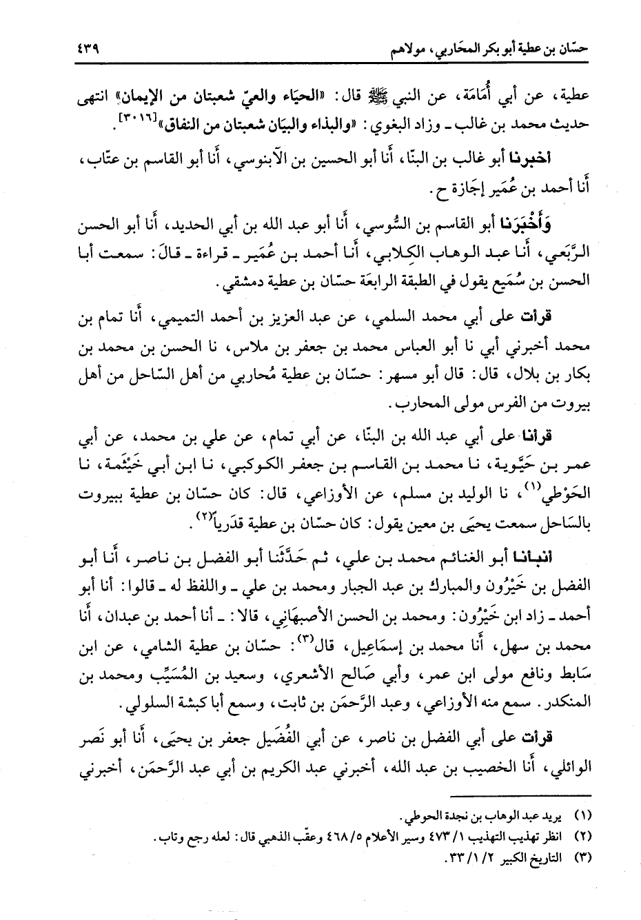 [3016] اخبرنا أبو غالب بن البنا أنا أبو الحسين بن الابنوسي أنا أبو القاسم بن عتاب أنا احمد بن عمير اجازة ح واخبرنا أبو القاسم بن السوسي أنا أبو عبد الله بن أبي الحديد أنا أبو الحسن الربعي أنا عبد الوهاب الكلابي أنا احمد بن عمير قراءة قال سمعت أبا الحسن بن سميع يقول في الطبقة الرابعة حسان بن عطية دمشقي قرأت على أبي محمد السلمي عن عبد العزيز بن احمد التميمي أنا تمام بن محمد اخبرني أبي نا أبو العباس محمد بن جعفر بن ملاس نا الحسن بن محمد بن بكار بن بلال قال قال أبو مسهر حسان بن عطية محاربي من أهل الساحل من أهل بيروت من الفرس مولى المحارب قرأنا على أبي عبد الله بن البنا عن أبي تمام عن علي بن محمد عن أبي عمر بن حيوية نا محمد بن القاسم بن جعفر الكوكبي نا ابن أبي خيثمة نا الحوطي (1) نا الوليد بن مسلم عن الاوزاعي قال كان حسان بن عطية ببيروت بالساحل سمعت يحيى بن معين يقول كان حسان بن عطية قدريا (2) أنبأنا أبو الغنائم محمد بن علي ثم حدثنا أبو الفضل بن ناصر أنا أبو الفضل بن خيرون والمبارك بن عبد الجبار ومحمد بن علي واللفظ له قالوا أنا محمد بن سهل أنا محمد بن إسماعيل قال (3) حسان بن عطية الشامي عن ابن سابط ونافع مولى ابن عمر وأبي صالح الاشعري وسعيد بن المسيب ومحمد بن المنكدر سمع منه الاوزاعي وعبد الرحمن بن ثابت وسمع أبا كبشة السلولي قرأت على أبي الفضل بن ناصر عن أبي الفضيل جعفر بن يحيى أنا أبو نصر الوائلي أنا الخصيب بن عبد الله اخبرني عبد الكريم بن أبي عبد الرحمن اخبرني