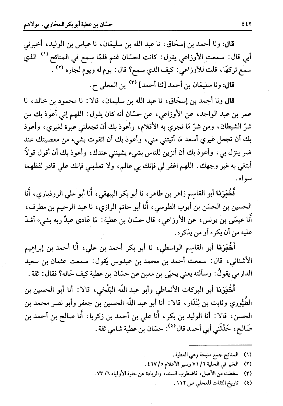 قال ونا سليمان بن احمد ثنا احمد (3) بن المعلى [ح] قال ونا احمد بن إسحاق نا عبد الله بن سليمان قالا نا محمود بن خالد نا عمر بن عبد الواحد عن الاوزاعي عن حسان انه كان يقول اللهم أني اعوذ بك من شر الشيطان ومن شر ما تجري به الاقلام واعوذ بك أن تجعلني عبرة لغيري واعوذ بك أن تجعل غيري اسعد ما أتيتني مني واعوذ بك أن اتقوت بشئ من معصيتك عند ضر ينزل بي واعوذ بك أن اتزين للناس بشئ يشينني عندك واعوذ بك أن اقول قولا ابتغي به غير وجهك اللهم اغفر لي فإنك بي عالم ولا تعذبني فإنك علي قادر لفظهما سواء اخبرنا أبو القاسم زاهر بن طاهر نا أبو بكر البيهقي نا أبو علي الروذباري أنا الحسين بن الحسن بن ايوب الطوسي أنا أبو حاتم الرازي نا عبد الرحيم بن مطرف أنا عيسى بن يونس عن الاوزاعي قال حسان بن عطية ما عادى عبد ربه بشئ اشد عليه من أن يكره أو من يذكره أخبرنا أبو القاسم الواسطي نا أبو بكر احمد بن علي أنا أحمد بن إبراهيم الاشناني قال سمعت احمد بن محمد بن عبدوس يقول سمعت عثمان بن سعيد الدارمي يقول وسألته يعني يحيى بن معين عن حسان بن عطية كيف حاله فقال ثقة أخبرنا أبو البركات الانماطي وأبو عبد الله البلخي قالا أنا أبو الحسين بن الطيوري وثابت بن بندار قالا أنا أبو عبد الله الحسين بن جعفر وأبو نصر محمد بن الحسن قالا أنا الوليد بن بكر أنا علي بن احمد بن زكريا أنا صالح بن احمد بن صالح حدثني أبي احمد قال (4) حسان بن عطية شامي ثقة