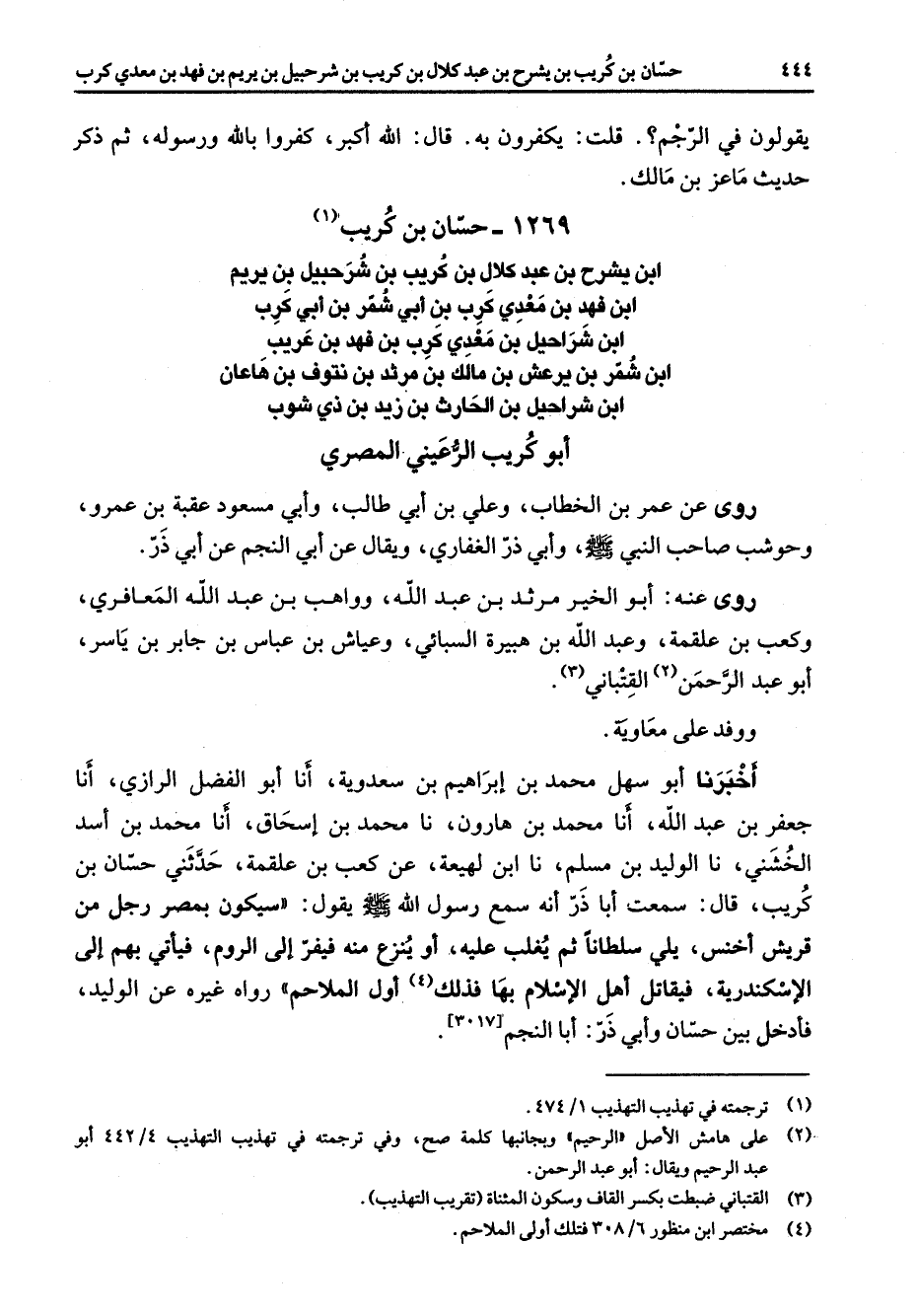 1269 - حسان بن كريب (1) ابن يشرح بن عبد كلال بن كريب بن شرحبيل بن يريم ابن فهد بن معدي كرب بن أبي شمر بن أبي كرب ابن شراحيل بن معدي كرب بن فهد بن عريب ابن شمر بن يرعش بن مالك بن مرثد بن نتوف بن هاعان ابن شراحيل بن الحارث بن زيد بن ذي شوب أبو كريب الرعيني المصري روى عن عمر بن الخطاب وعلي بن أبي طالب وأبي مسعود عقبة بن عمرو وحوشب صاحب النبي صلى الله عليه وسلم وأبي ذر الغفاري ويقال عن أبي النجم عن أبي ذر روى عنه أبو الخير مرثد بن عبد الله وواهب بن عبد الله المعافري وكعب بن علقمة وعبد الله بن هبيرة السبائي وعياش بن عباس بن جابر بن ياسر أبو عبد الرحمن (2) القتباني (3)