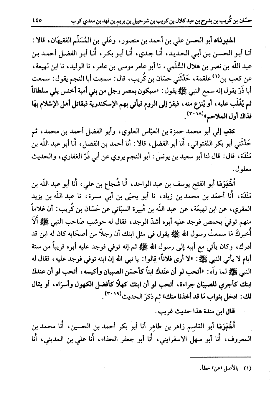 [3018] كتب الي أبو محمد حمزة بن العباس العلوي وأبو الفضل احمد بن محمد ثم حدثني أبو بكر اللفتواني أنا أبو الفضل قالا أنا احمد بن الفضل أنا أبو عبد الله بن مندة قال قال لنا أبو سعيد بن يونس أبو النجم يروي عن أبي ذر الغفاري والحديث معلول اخبرنا أبو الفتح يوسف بن عبد الواحد أنا شجاع بن علي أنا أبو عبد الله بن مندة أنا احمد بن محمد بن زياد نا أبو يحيى بن أبي مسرة نا عبد الله بن يزيد المقري عن ابن لهيعة عن عبد الله بن هبيرة السبائي عن حسان بن كريب أن غلاما منهم توفي بحمص فوجد عليه أبوه اشد الوجد فقال له حوشب صاحب النبي صلى الله عليه وسلم إلا اخبرك ما سمعت رسول الله صلى الله عليه وسلم يقول في مثل ابنك أن رجلا من اصحابه كان له ابن قد أدرك وكان يأتي مع أبيه إلى رسول الله صلى الله عليه وسلم ثم انه توفي فوجد عليه أبوه قريبا من ستة أيام لا يأتي النبي صلى الله عليه وسلم لا ارى فلانا قالوا يا نبي الله أن ابنه توفي فوجد عليه فقال له النبي صلى الله عليه وسلم لما رآه اتحب لو أن عندك ابنا كأحسن الصبيان واكيسه اتحب لو أن عندك ابنك كأجري للصبيان جراءة اتحب لو أن ابنك كهلا كأفضل الكهول واسراه أو يقال لك ادخل بثواب ما قد اخذنا منك ثم ذكر الحديث