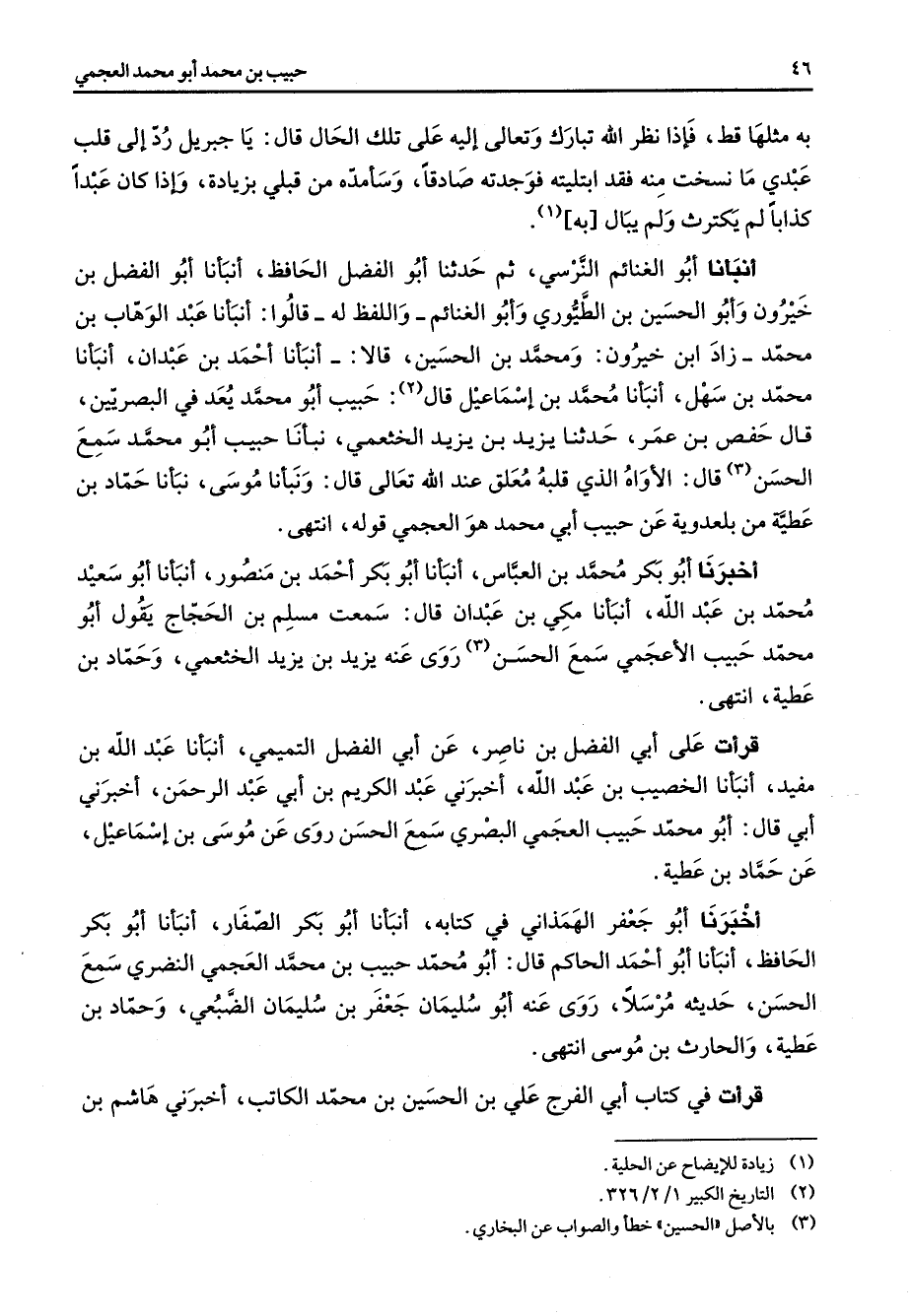 به مثلها قط فإذا نظر الله تبارك وتعالى إليه على تلك الحال قال يا جبريل رد إلى قلب عبدي ما نسخت منه فقد ابتليته فوجدته صادقا وسأمده من قبلي بزيادة وإذا كان عبدا كذابا لم يكترث ولم يبال به (1) أنبانا أبو الغنائم النرسي ثم حدثنا أبو الفضل الحافظ أنبأنا أبو الفضل بن خيرون وأبو الحسين بن الطيوري وأبو الغنائم واللفظ له قالوا أنبأنا عبد الوهاب بن محمد زاد ابن خيرون ومحمد بن الحسين قالا أنبانا أحمد بن عبدان أنبأنا محمد بن سهل أنبأنا محمد بن إسماعيل قال (2) حبيب أبو محمد يعد في البصريين قال حفص بن عمر حدثنا يزيد بن يزيد الخثعمي نبأنا حبيب أبو محمد سمع الحسن (3) قال الأواه الذي قلبه معلق عند الله تعالى قال ونبأنا موسى نبأنا حماد بن عطية من بلعدوية عن حبيب أبي محمد هو العجمي قوله انتهى أخبرنا أبو بكر محمد بن العباس أنبأنا أبو بكر أحمد بن منصور أنبأنا أبو سعيد محمد بن عبد الله أنبأنا مكي بن عبدان قال سمعت مسلم بن الحجاج يقول أبو محمد حبيب الأعجمي سمع الحسن (3) روى عنه يزيد بن يزيد الخثعمي وحماد بن عطية انتهى قرأت على أبي الفضل بن ناصر عن أبي الفضل التميمي أنبأنا عبد الله بن مفيد أنبأنا الخصيب بن عبد الله أخبرني عبد الكريم بن أبي عبد الرحمن أخبرني أبي قال أبو محمد حبيب العجمي البصري سمع الحسن روى عن موسى بن إسماعيل عن حماد بن عطية أخبرنا أبو جعفر الهمذاني في كتابه أنبأنا أبو بكر الصفار أنبأنا أبو بكر الحافظ أنبأنا أبو أحمد الحاكم قال أبو محمد حبيب بن محمد العجمي النضري سمع الحسن حديثه مرسلا روى عنه أبو سليمان جعفر بن سليمان الضبعي وحماد بن عطية والحارث بن موسى انتهى قرأت في كتاب أبي الفرج علي بن الحسين بن محمد الكاتب أخبرني هاشم بن