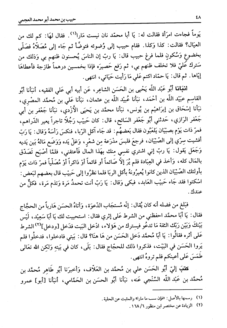 يوما فجاءت امرأة فقالت له يا أبا محمد نان نيست مارا (1) فقال لها كم لك من العيال فقالت كذا وكذا فقام حبيب إلى وضوئه فتوضأ ثم جاء إلى مصلاه فصلى بخضوع وسكون فلما فرغ حبيب قال يا رب إن الناس يحسنون ظنهم بي وذلك من سترك علي فلا تخلف ظنهم بي ثم رفع حصيره فإذا بخمسين درهما طازجة فأعطاها إياها ثم قال يا حماد اكتم علي ما رأيت حياتي انتهى أنبأنا أبو عبد الله يحيى بن الحسن الشاعر عن أبيه أبي علي الفقيه أنبأنا أبو القاسم عبيد الله بن أحمد نبأنا عبيد الله بن عثمان نبأنا علي بن محمد المصري نبأنا إسحاق بن إبراهيم بن يونس نبأنا محمد بن يحيى الأزدي نبأنا جعفر بن أبي جعفر الرازي حدثني أبو جعفر السائح قال كان حبيب رجلا تاجرا يعير الدراهم فمر ذات يوم بصبيان يلعبون فقال بعضهم قد جاء آكل الربا فنكس رأسه وقال يا رب أفشيت سري إلى الصبيان فرجع فلبس مدرعة من شعر وغل يده ووضع ماله بين يديه وجعل يقول يا رب إني أشترى نفسي منك بهذا المال فاعتقني فلما أصبح تصدق بالمال كله وأخذ في العبادة فلم ير إلا صائما أو قائما أو ذاكرا أو مصليا فمر ذات يوم بأولئك الصبيان الذين كانوا يعيرونه بأكل الربا فلما نظروا إلى حبيب قال بعضهم لبعض اسكتوا فقد جاء حبيب العابد فبكى وقال يا رب أنت تحمد مرة وتذم مرة فكل من عندك فبلغ من فضله أنه كان يقال إنه مستجاب الدعوة وأتاه الحسن هاربا من الحجاج فقال يا أبا محمد احفظني من الشرط على إثري فقال استحييت لك يا أبا سعيد ليس بينك وبين ربك الثقة ما تدعو فيسترك من هؤلاء ادخل البيت فدخل ودخل (2) الشرط على أثره فقالوا يا أبا محمد دخل الحسن من ها هنا قال بيتي فادخلوا فدخلوا فلم يروا الحسن في البيت فذكروا ذلك للحجاج فقال بلى كان في بيته ولكن الله تعالى طمس على أعينكم فلم تروه انتهى كتب إلي أبو الحسن علي بن محمد بن العلاف وأخبرنا أبو طاهر محمد بن محمد بن عبد الله السنجي عنه نبأنا أبو الحسن بن الحمامي أنبأنا أبو عمرو