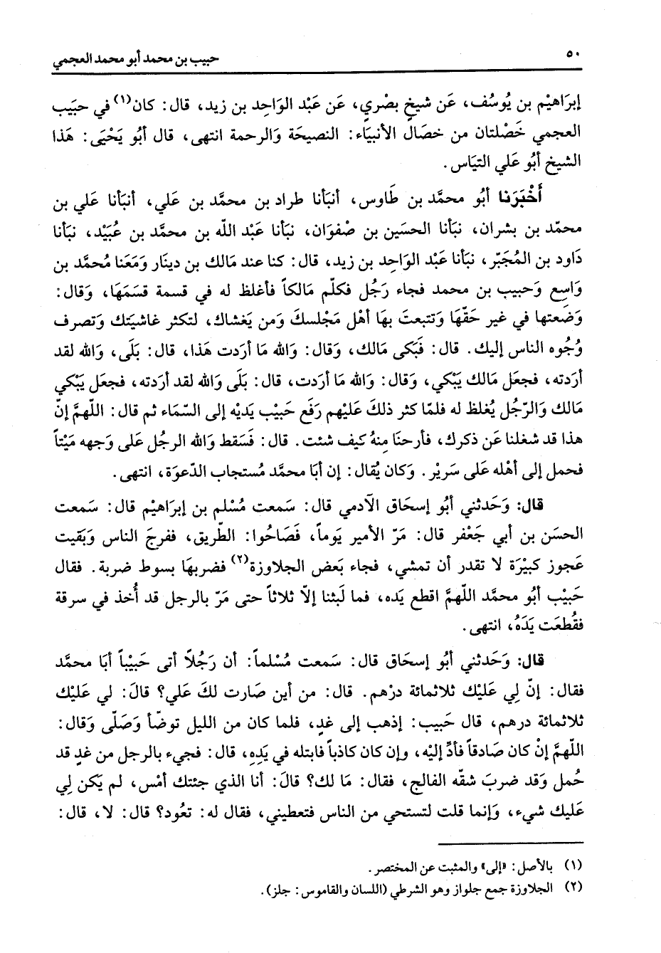 إبراهيم بن يوسف عن شيخ بصري عن عبد الواحد بن زيد قال كان (1) في حبيب العجمي خصلتان من خصال الأنبياء النصيحة والرحمة انتهى قال أبو يحيى هذا الشيخ أبو علي التياس أخبرنا أبو محمد بن طاوس أنبانا طراد بن محمد بن علي أنبأنا علي بن محمد بن بشران نبأنا الحسين بن صفوان نبأنا عبد الله بن محمد بن عبيد أنبأنا داود بن المجبر نبأنا عبد الواحد بن زيد قال كنا عند مالك بن دينار ومعنا محمد بن واسع وحبيب بن محمد فجاء رجل فكلم مالكا فأغلظ له في قسمة قسمها وقال وضعتها في غير حقها وتتبعت بها أهل مجلسك ومن يغشاك لتكثر غاشيتك وتصرف وجوه الناس إليك قال فبكى مالك وقال والله ما أردت هذا قال بلى والله لقد أردته فجعل مالك يبكي وقال والله ما أردت قال بلى والله لقد أردته فجعل يبكي مالك والرجل يغلظ له فلما كثر ذلك عليهم رفع حبيب يديه إلى السماء ثم قال اللهم إن هذا قد شغلنا عن ذكرك فأرحنا منه كيف شئت قال فسقط والله الرجل على وجهه ميتا فحمل إلى أهله على سرير وكان يقال إن أبا محمد مستجاب الدعوة انتهى قال وحدثني أبو إسحاق الآدمي قال سمعت مسلم بن إبراهيم قال سمعت الحسن بن أبي جعفر قال مر الأمير يوما فصاحوا الطريق ففرج الناس وبقيت عجوز كبيرة لا تقدر أن تمشي فجاء بعض الجلاوزة (2) فضربها بسوط ضربة فقال حبيب أبو محمد اللهم اقطع يده فما لبثنا إلا ثلاثا حتى مر بالرجل قد أخذ في سرقة فقطعت يده انتهى قال وحدثني أبو إسحاق قال سمعت مسلما أن رجلا أتى حبيبا أبا محمد فقال إن لي عليك ثلاثمائة درهم قال من أين صارت لك علي قال لي عليك ثلاثمائة درهم قال حبيب اذهب إلى غد فلما كان من الليل توضأ وصلى وقال اللهم إن كان صادقا فأد إليه وإن كان كاذبا فابتله في يده قال فجئ بالرجل من غد قد حمل وقد ضرب شقه الفالج فقال ما لك قال أنا الذي جئتك أمس لم يكن لي عليك شئ وإنما قلت لتستحي من الناس فتعطيني فقال له تعود قال لا قال