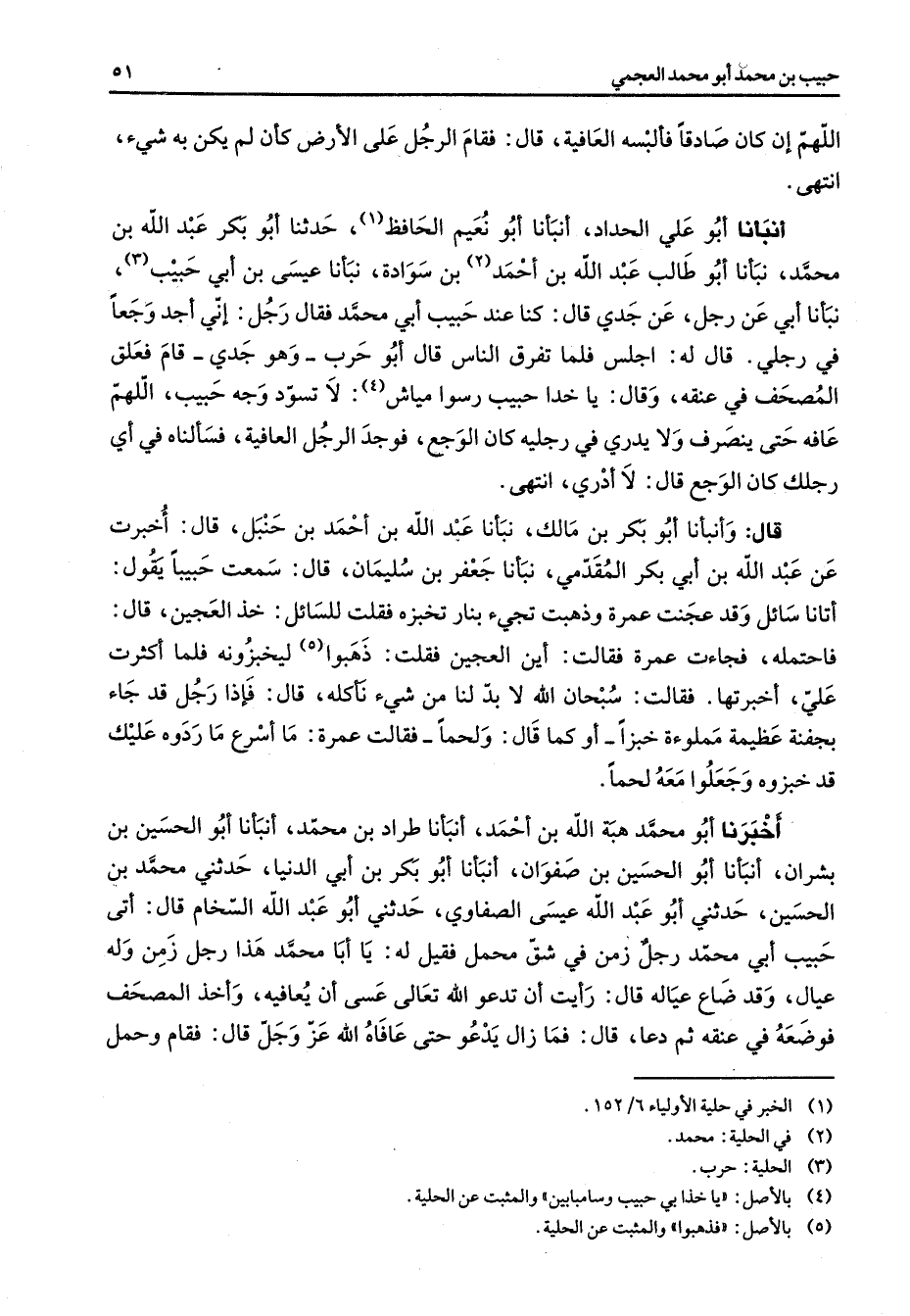 اللهم إن كان صادقا فألبسه العافية قال فقام الرجل على الأرض كأن لم يكن به شئ انتهى أنبأنا أبو علي الحداد أنبأنا أبو نعيم الحافظ (1) حدثنا أبو بكر عبد الله بن محمد نبأنا أبو طالب عبد الله بن أحمد (2) بن سوادة نبأنا عيسى بن أبي حبيب (3) نبأنا أبي عن رجل عن جدي قال كنا عند حبيب أبي محمد فقال رجل إني أجد وجعا في رجلي قال له اجلس فلما تفرق الناس قال أبو حرب وهو جدي قام فعلق المصحف في عنقه وقال يا خدا حبيب رسوا مياش (4) لا تسود وجه حبيب اللهم عافه حتى ينصرف ولا يدري في رجليه كان الوجع فوجد الرجل العافية فسألناه في أي رجلك كان الوجع قال لا أدري انتهى قال وأنبأنا أبو بكر بن مالك نبأنا عبد الله بن أحمد بن حنبل قال أخبرت عن عبد الله بن أبي بكر المقدمي نبأنا جعفر بن سليمان قال سمعت حبيبا يقول أتانا سائل وقد عجبت عمرة وذهبت تجئ بنار تخبزه فقلت للسائل خذ العجين قال فاحتمله فجاءت عمرة فقالت أين العجين فقلت ذهبوا (5) ليخبزونه فلما أكثرت علي أخبرتها فقالت سبحان الله لا بد لنا من شئ نأكله قال فإذا رجل قد جاء بجفنة عظيمة مملوءة خبزا أو كما قال ولحما فقالت عمرة ما أسرع ما ردوه عليك قد خبزوه وجعلوا معه لحما أخبرنا أبو محمد هبة الله بن أحمد أنبأنا طراد بن محمد أنبأنا أبو الحسين بن بشران أنبأنا أبو الحسين بن صفوان أنبأنا أبو بكر بن أبي الدنيا حدثني محمد بن الحسين حدثني أبو عبد الله عيسى الصفاوي حدثني أبو عبد الله السخام قال أتى حبيب أبي محمد رجل زمن في شق محمل فقيل له يا أبا محمد هذا رجل زمن وله عيال وقد ضاع عياله قال رأيت أن تدعو الله تعالى عسى أن يعافيه وأخذ المصحف فوضعه في عنقه ثم دعا قال فما زال يدعو حتى عافاه الله عز وجل قال فقام وحمل