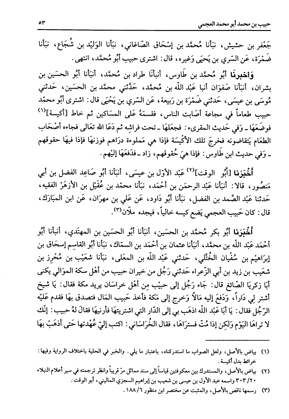 جعفر بن حشيش نبأنا محمد بن إسحاق الصاغاني نبأنا الوليد بن شجاع نبأنا ضمرة عن السري بن يحيى وغيره قال اشترى حبيب أبو محمد انتهى وأخبرنا أبو محمد بن طاوس أنبانا طراد بن محمد أنبأنا أبو الحسين بن بشران أنبأنا صفوان أنبا عبد الله بن محمد حدثني محمد بن الحسين حدثني موسى بن عيسى حدثني ضمرة بن ربيعة عن السري بن يحيى قال اشترى أبو محمد حبيب طعاما في مجاعة أصابت الناس فقسمه على المساكين ثم خاط أكيسة (1) فوضعها وفي حديث المقرئ فجعلها تحت فراشه ثم دعا الله تعالى فجاءه أصحاب الطعام يتقاضونه فخرج تلك الأكيسة فإذا هي مملوءة دراهم فوزنها فإذا فيها حقوقهم وفي حديث ابن طاوس فإذا هي حقوقهم زاد فدفعها إليهم أخبرنا أبو الوقت (2) عبد الأول بن عيسى أنبأنا أبو صاعد الفضل بن أبي منصور قالا أنبأنا عبد الرحمن بن أحمد نبأنا محمد بن عقيل بن الأزهر الفقيه حدثنا عبد الصمد بن الفضل نبأنا أبو داود عن علي بن مهران عن ابن المبارك قال كان حبيب العجمي يضع كيسه خاليا فيجده ملآن (3) أخبرنا أبو بكر محمد بن الحسين أنبأنا أبو الحسين بن المهتدي أنبأنا أبو أحمد عبد الله بن محمد أنبأنا عثمان بن أحمد بن السماك نبأنا أبو القاسم إسحاق بن إبراهيم بن سفيان الختلي حدثني عبد الله بن المعلى نبأنا شعيب بن محرز بن شعيب بن زيد بن أبي الزعراء حدثني رجل من خيران حبيب من أهل سكة الموالي يكنى أبا زكريا الصائغ قال جاء رجل إلى حبيب من أهل خراسان يريد مكة فقال يا شيخ أشتر لي دارا ودفع إليه مالا وخرج إلى مكة فأخذ حبيب المال فتصدق بها فقدم عليه الرجل فقال يا أبا عبد الله اذهب بي إلى الدار التي اشتريتها فأرنيها فقال له حبيب إنك لا تراها اليوم ولكن إذا مت فستراها فقال الخراساني اكتب إلي عهدتها حتى أذهب بها