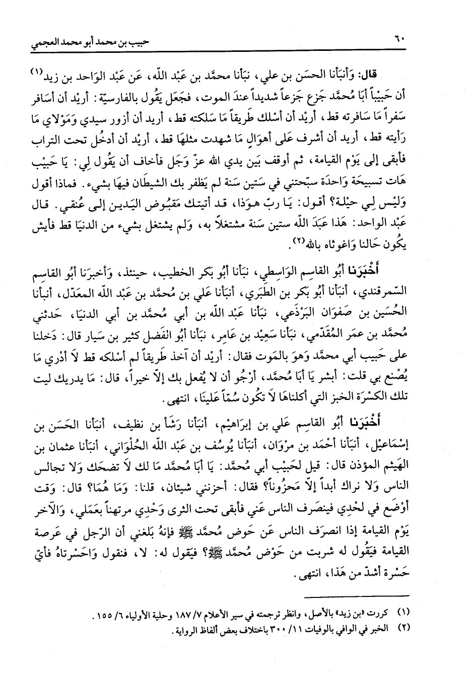 أخبرنا أبو القاسم الواسطي نبأنا أبو بكر الخطيب حينئذ وأخبرنا أبو القاسم السمرقندي أنبأنا أبو بكر بن الطبري أنبأنا علي بن محمد بن عبد الله المعدل أنبأنا الحسين بن صفوان البرذعي نبأنا عبد الله بن أبي محمد بن أبي الدنيا حدثني محمد بن عمر المقدمي نبأنا سعيد بن عامر نبأنا أبو الفضل كثير بن سيار قال دخلنا على حبيب أبي محمد وهو بالموت فقال أريد أن آخذ طريقا لم أسلكه قط لا أدري ما يصنع بي قلت ابشر يا أبا محمد أرجو أن لا يفعل بك إلا خيرا قال ما يدريك ليت تلك الكسرة الخبز التي أكلناها لا تكون سما علينا انتهى أخبرنا أبو القاسم علي بن إبراهيم أنبأنا رشأ بن نظيف أنبأنا الحسن بن إسماعيل أنبأنا أحمد بن مروان أنبأنا يوسف بن عبد الله الحلواني أنبأنا عثمان بن الهيثم المؤذن قال قيل لحبيب أبي محمد يا أبا محمد ما لك لا تضحك ولا تجالس الناس ولا نراك أبدا إلا محزونا فقال أحزنني شيئان قلنا وما هما قال وقت أوضع في لحدي فينصرف الناس عني فأبقى تحت الثرى وحدي مرتهنا بعملي والآخر يوم القيامة إذا انصرف الناس عن حوض محمد (صلى الله عليه وسلم) فإنه بلغني أن الرجل في عرصة القيامة فيقول له شربت من حوض محمد (صلى الله عليه وسلم) فيقول له لا فنقول واحسرتاه فأي حسرة أشد من هذا انتهى
