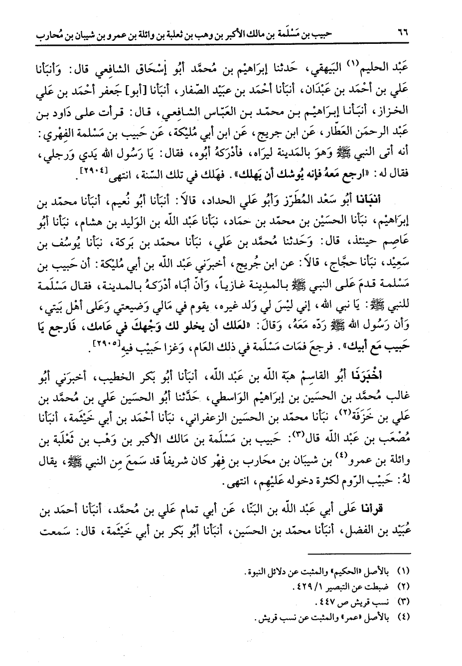 عبد الحليم (1) البيهقي حدثنا إبراهيم بن محمد أبو إسحاق الشافعي قال وأنبأنا علي بن أحمد بن عبدان أنبأنا أحمد بن عبيد الصفار أنبأنا أبو جعفر أحمد بن علي الخزاز أنبأنا إبراهيم بن محمد بن العباس الشافعي قال قرأت على داود بن عبد الرحمن العطار عن ابن جريج عن ابن أبي مليكة عن حبيب بن مسلمة الفهري أنه أتى النبي (صلى الله عليه وسلم) وهو بالمدينة ليراه فأدركه أبوه فقال يا رسول الله يدي ورجلي فقال له ارجع معه فإنه يوشك أن يهلك فهلك في تلك السنة انتهى أنبأنا أبو سعد المطرز وأبو علي الحداد قالا أنبأنا أبو نعيم أنبأنا محمد بن إبراهيم نبأنا الحسين بن محمد بن حماد نبأنا عبد الله بن الوليد بن هشام نبأنا أبو عاصم حينئذ قال وحدثنا محمد بن علي نبأنا محمد بن بركة نبأنا يوسف بن سعيد نبأنا حجاج قالا عن ابن جريج أخبرني عبد الله بن أبي مليكة أن حبيب بن مسلمة قدم على النبي (صلى الله عليه وسلم) بالمدينة غازيا وان أباه أدركه بالمدينة فقال مسلمة للنبي (صلى الله عليه وسلم) يا نبي الله إني ليس لي ولد غيره يقوم في مالي وضيعتي وعلى أهل بيتي وان رسول الله (صلى الله عليه وسلم) رده معه وقال لعلك أن يخلو لك وجهك في عامك فارجع يا حبيب مع أبيك فرجع فمات مسلمة في ذلك العام وغزا حبيب فيه أخبرنا أبو القاسم هبة الله بن عبد الله أنبأنا أبو بكر الخطيب أخبرني أبو غالب محمد بن الحسين بن إبراهيم الواسطي حدثنا أبو الحسين علي بن محمد بن علي بن خزفة (2) نبأنا محمد بن الحسين الزعفراني نبأنا أحمد بن أبي خيثمة أنبأنا مصعب بن عبد الله قال (3) حبيب بن مسلمة بن مالك الأكبر بن وهب بن ثعلبة بن وائلة بن عمرو (4) بن شيبان بن محارب بن فهر كان شريفا قد سمع من النبي (صلى الله عليه وسلم) يقال له حبيب الروم لكثرة دخوله عليهم انتهى قرأنا على أبي عبد الله بن البنا عن أبي تمام علي بن محمد أنبأنا أحمد بن عبيد بن الفضل أنبأنا محمد بن الحسين أنبأنا أبو بكر بن أبي خيثمة قال سمعت