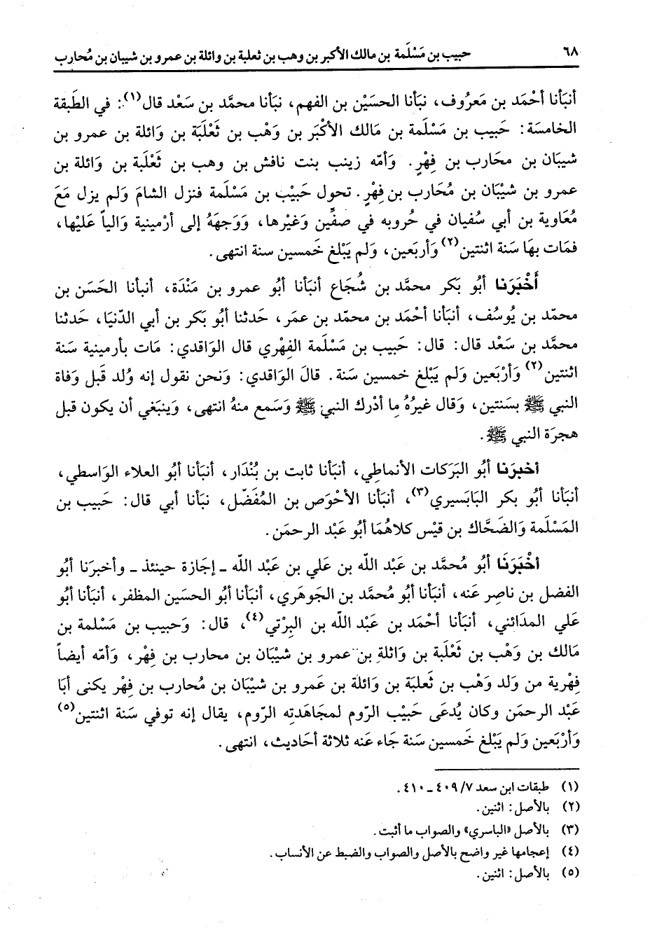 أنبأنا أحمد بن معروف نبأنا الحسين بن الفهم نبأنا محمد بن سعد قال (1) في الطبقة الخامسة حبيب بن مسلمة بن مالك الأكبر بن وهب بن ثعلبة بن وائلة بن عمرو بن شيبان بن محارب بن فهر وأمه زينب بنت نافش بن وهب بن ثعلبة بن وائلة بن عمرو بن شيبان بن محارب بن فهر تحول حبيب بن مسلمة فنزل الشام ولم يزل مع معاوية بن أبي سفيان في حروبه في صفين وغيرها ووجهه إلى أرمينية واليا عليها فمات بها سنة اثنتين (2) وأربعين ولم يبلغ خمسين سنة انتهى أخبرنا أبو بكر محمد بن شجاع أنبأنا أبو عمرو بن مندة أنبأنا الحسن بن محمد بن يوسف أنبأنا أحمد بن محمد بن عمر حدثنا أبو بكر بن أبي الدنيا حدثنا محمد بن سعد قال قال حبيب بن مسلمة الفهري قال الواقدي مات بأرمينية سنة اثنتين (2) وأربعين ولم يبلغ خمسين سنة قال الواقدي ونحن نقول إنه ولد قبل وفاة النبي (صلى الله عليه وسلم) بسنتين وقال غيره ما أدرك النبي (صلى الله عليه وسلم) وسمع منه انتهى وينبغي أن يكون قبل هجرة النبي (صلى الله عليه وسلم) أخبرنا أبو البركات الأنماطي أنبأنا ثابت بن بندار أنبأنا أبو العلاء الواسطي أنبأنا أبو بكر البابسيري (3) أنبانا الأحوص بن المفضل نبأنا أبي قال حبيب بن المسلمة والضحاك بن قيس كلاهما أبو عبد الرحمن أخبرنا أبو محمد بن عبد الله بن علي بن عبد الله إجازة حينئذ وأخبرنا أبو الفضل بن ناصر عنه أنبأنا أبو محمد بن الجوهري أنبأنا أبو الحسين المظفر أنبأنا أبو علي المدائني أنبأنا أحمد بن عبد الله بن البرتي (4) قال وحبيب بن مسلمة بن مالك بن وهب بن ثعلبة بن واثلة بن عمرو بن شيبان بن محارب بن فهر وأمه أيضا فهرية من ولد وهب بن ثعلبة بن وائلة بن عمرو بن شيبان بن محارب بن فهر يكنى أبا عبد الرحمن وكان يدعى حبيب الروم لمجاهدته الروم يقال إنه توفي سنة اثنتين (5) وأربعين ولم يبلغ خمسين سنة جاء عنه ثلاثة أحاديث انتهى