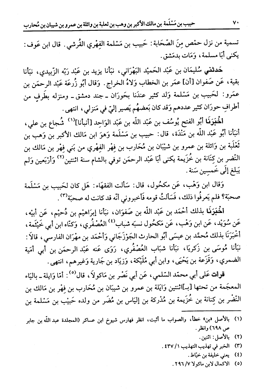 أخبرنا بذلك أحمد بن عبد الله بن صفوان نبأنا إبراهيم بن دحيم عن أبيه عن سويد عن ابن وهب عن مكحول نسبه شباب (4) العصفري وكناه ابن أبي خيثمة أخبرنا بذلك محمد بن عيسى أبو الحارث الجوزجاني وأحمد بن مهران الفارسي قالا نبأنا موسى بن زكريا نبأنا شباب العصفري روى عنه عبد الرحمن بن أبي أمية الضمري وقزعة بن يحيى وابن أبي مليكة وزياد بن جارية وغيرهم انتهى قرأت على أبي محمد السلمي عن أبي نصر بن ماكولا قال (5) أما وايلة بالياء المعجمة من تحتها باثنتين وايلة بن عمرو بن شيبان بن محارب بن فهر بن مالك بن النضر بن كنانة بن خزيمة بن مدركة بن إلياس بن مضر من ولده حبيب بن مسلمة بن