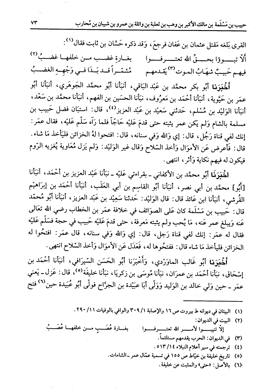 القرى بلغه مقتل عثمان بن عفان فرجع وقد ذكره حسان بن ثابت فقال (1) ألا تبوؤا بحق الله تعترفوا * بغارة غضب من خلفها غضب * (2) فيهم حبيب شهاب الموت (3) يقدمهم * مشمرا قد بدا في وجهه الغضب * أخبرنا أبو بكر محمد بن عبد الباقي أنبأنا أبو محمد الجوهري أنبأنا أبو عمر بن حيوية أنبأنا أحمد بن معروف نبأنا الحسين بن الفهم أنبأنا محمد بن سعد أنبأنا الوليد بن مسلم حدثني سعيد بن عبد العزيز (4) قال استبان فضل حبيب بن مسلمة بالشام ولم يكن عمر يثبته حتى قدم عليه حاجا فلما رآه سلم عليه فقال عمر إنك لفي قناة رجل قال إي والله وفي سنانه قال افتحوا له الخزائن فليأخذ ما شاء قال فأعرض عن الأموال وأخذ السلاح وقال غير الوليد ولم يزل معاوية يغزيه الروم فيكون له فيهم نكاية وأثر انتهى أخبرنا أبو محمد بن الأكفاني بقراءتي عليه نبأنا عبد العزيز بن أحمد أنبأنا أبو محمد بن أبي نصر أنبأنا أبو القاسم بن أبي العقب أنبأنا أحمد بن إبراهيم القرشي أنبأنا ابن عائذ قال قال الوليد حدثنا سعيد بن عبد العزيز أنبأنا أبو محمد قال حبيب بن مسلمة كان على الصوائف في خلافة عمر بن الخطاب رضي الله تعالى عنه ويبلغ عمر عنه ما يحب ولم يثبته معرفة حتى قدم عليه حبيب في حجة فسلم عليه فقال له عمر إنك لفي قناة رجل قال إي والله وفي سنانه قال عمر افتحوا له الخزائن فليأخذ ما شاء قال ففتحوها له فعدل عن الأموال وأخذ السلاح انتهى أخبرنا أبو غالب الماوردي وأخبرنا أبو الحسن السيرافي أنبأنا أحمد بن إسحاق نبأنا أحمد بن عمران نبأنا موسى بن زكريا نبأنا خليفة (5) قال عزل يعني عمر حين ولي خالد بن الوليد وولى أبا عبيدة بن الجراح فولى أبو عبيدة حين (6) فتح