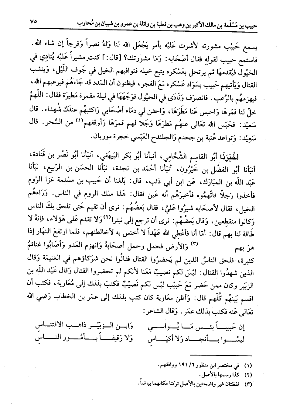 يسمع حبيب مشورته لأشرت عليه بأمر يجعل الله لنا وله نصرا وفرجا إن شاء الله فاستمع حبيب لقوله فقال أصحابه وما مشورتك قال كنت مشيرا عليه ينادي في الخيول فيقدمها ثم يرتحل بعسكره يتبع خيله فتوافيهم الخيل في جوف الليل وينشب القتال ويأتيهم حبيب بسواد عسكره مع الفجر فيظنون أن المدد قد جاءهم فيرعبهم الله فيهزمهم بالرعب فانصرف ونادى في الخيول فوجهها في ليلة مقمرة مطيرة فقال اللهم خل لنا قمرها واحبس عنا مطرها واحقن لي دماء أصحابي واكتبهم عندك شهداء قال سعيد فحبس الله تعالى عنهم مطرها وجلا لهم قمرها وأوقفهم (1) من السحر قال سعيد وتواعد عتبة بن جحدم والجلندح العبسي حجرة موريان أخبرنا أبو القاسم الشحامي أنبأنا أبو بكر البيهقي أنبأنا أبو نصر بن قتادة أنبأنا أبو الفضل بن خيرون أنبأنا أحمد بن نجدة نبأنا الحسن بن الربيع نبأنا عبد الله بن المبارك عن ابن أبي ذئب قال بلغنا أن حبيب بن مسلمة غزا الروم فأخذوا رجلا فاتهموه فأخبرهم أنه عين فقال هذا ملك الروم في الناس وراءهم الخيل فقال لأصحابه شيروا علي فقال بعضهم نرى أن تقيم حتى تلحق بك الناس وكانوا منقطعين وقال بعضهم نرى أن ترجع إلى نيترا (2) ولا تقدم على هؤلاء فإنه لا طاقة لنا بهم قال أما أنا فأعطي الله عهدا لا أخنس به لأخالطنهم فلما ارتفع النهار إذا هو بهم (3) والأرض فحمل وحمل أصحابه وانهزم العدو وأصابوا غنائم كثيرة فلحق الناس الذين لم يحضروا القتال فقالوا نحن شركاؤهم في الغنيمة وقال الذين شهدوا القتال ليس لكم نصيب معنا لأنكم لم تحضروا القتال وقال عبد الله بن الزبير وكان ممن حضر مع حبيب ليس لكم نصيب فكتب بذلك إلى معاوية فكتب أن اقسم بينهم كلهم قال وأظن معاوية كان كتب بذلك إلى عمر بن الخطاب رضي الله تعالى عنه فكتب بذلك عمر وقال الشاعر إن حبيبا بئس ما يواسي * وابن الزبير ذاهب الاقتناس ليسوا بأنجاد ولا أكياس * ولا رقيقا بأمور الناس *