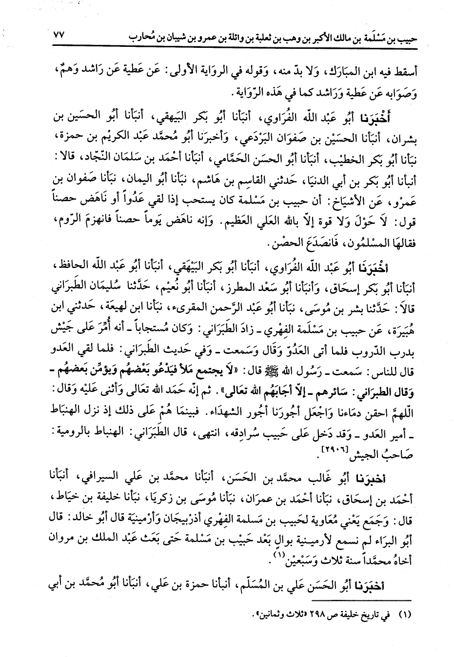 أسقط فيه ابن المبارك ولا بد منه وقوله في الرواية الأولى عن عطية عن راشد وهم وصوابه عن عطية وراشد كما في هذه الرواية أخبرنا أبو عبد الله الفراوي أنبأنا أبو بكر البيهقي أنبأنا أبو الحسين بن بشران أنبأنا الحسين بن صفوان البردعي وأخبرنا أبو محمد عبد الكريم بن حمزة نبأنا أبو بكر الخطيب أنبأنا أبو الحسن الحمامي أنبأنا أحمد بن سلمان النجاد قالا أنبأنا أبو بكر بن أبي الدنيا حدثني القاسم بن هاشم نبأنا أبو اليمان نبأنا صفوان بن عمرو عن الأشياخ أن حبيب بن مسلمة كان يستحب إذا لقي عدوا أو ناهض حصنا قول لا حول ولا قوة إلا بالله العلي العظيم وإنه ناهض يوما حصنا فانهزم الروم فقالها المسلمون فانصدع الحصن أخبرنا أبو عبد الله الفراوي أنبأنا أبو بكر البيهقي أنبأنا أبو عبد الله الحافظ أنبأنا أبو بكر إسحاق وأنبأنا أبو سعد المطرز أنبأنا أبو نعيم حدثنا سليمان الطبراني قالا حدثنا بشر بن موسى نبأنا أبو عبد الرحمن المقرئ نبأنا ابن لهيعة حدثني ابن هبيرة عن حبيب بن مسلمة الفهري زاد الطبراني وكان مستجابا أنه أمر على جيش يدرب الدروب فلما أتى العدو وقال وسمعت وفي حديث الطبراني فلما لقي العدو قال للناس سمعت رسول الله (صلى الله عليه وسلم) قال لا يجتمع ملأ فيدعو بعضهم ويؤمن بعضهم وقال الطبراني سائرهم إلا أجابهم الله تعالى ثم إنه حمد الله تعالى وأثنى عليه وقال اللهم احقن دماءنا واجعل أجورنا أجور الشهداء فبينما هم على ذلك إذ نزل الهنباط أمير العدو وقد دخل على حبيب سرادقه انتهى قال الطبراني الهنباط بالرومية صاحب الجيش أخبرنا أبو غالب محمد بن الحسن أنبأنا محمد بن علي السيرافي أنبأنا أحمد بن إسحاق نبأنا أحمد بن عمران نبأنا موسى بن زكريا نبأنا خليفة بن خياط قال وجمع يعني معاوية لحبيب بن مسلمة الفهري أذربيجان وأرمينية قال أبو خالد قال أبو البراء لم نسمع لأرمينية بوال بعد حبيب بن مسلمة حتى بعث عبد الملك بن مروان أخاه محمدا سنة ثلاث وسبعين (1) أخبرنا أبو الحسن علي بن المسلم أنبأنا حمزة بن علي أنبأنا أبو محمد بن أبي