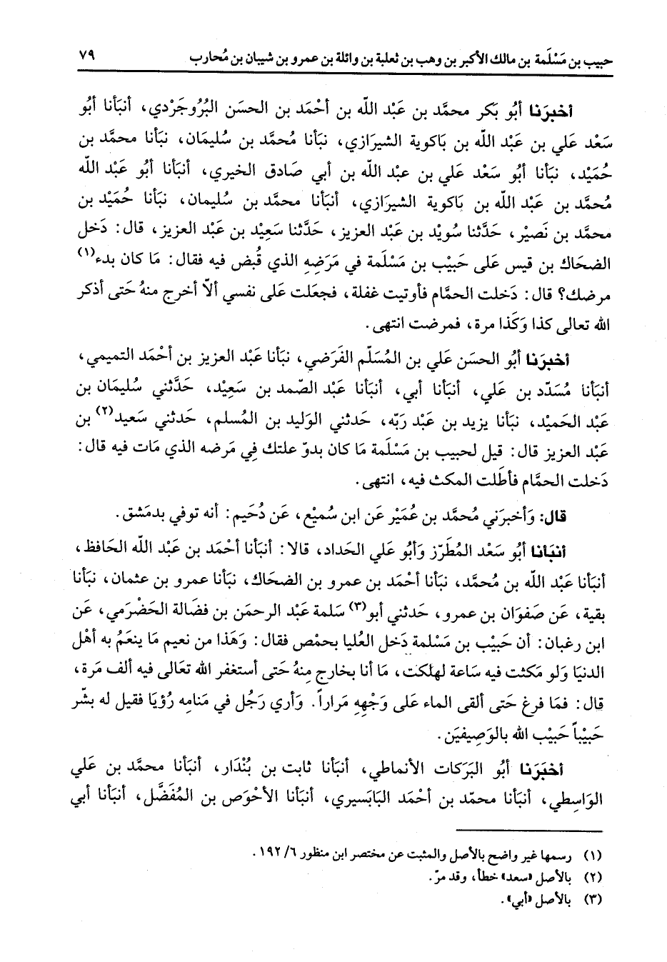 أخبرنا أبو بكر محمد بن عبد الله بن أحمد بن الحسن البروجردي أنبأنا أبو سعد علي بن عبد الله بن باكوية الشيرازي نبأنا محمد بن سليمان نبأنا محمد بن حميد نبأنا أبو سعد علي بن عبد الله بن أبي صادق الخيري أنبأنا أبو عبد الله محمد بن عبد الله بن باكوية الشيرازي أنبأنا محمد بن سليمان نبأنا حميد بن محمد بن نصير حدثنا سويد بن عبد العزيز حدثنا سعيد بن عبد العزيز قال دخل الضحاك بن قيس على حبيب بن مسلمة في مرضه الذي قبض فيه فقال ما كان بدء (1) مرضك قال دخلت الحمام فأوتيت غفلة فجعلت على نفسي ألا أخرج منه حتى أذكر الله تعالى كذا وكذا مرة فمرضت انتهى أخبرنا أبو الحسن علي بن المسلم الفرضي نبأنا عبد العزيز بن أحمد التميمي أنبأنا مسدد بن علي أنبأنا أبي أنبأنا عبد الصمد بن سعيد حدثني سليمان بن عبد الحميد نبأنا يزيد بن عبد ربه حدثني الوليد بن المسلم حدثني سعيد (2) بن عبد العزيز قال قيل لحبيب بن مسلمة ما كان بدو علتك في مرضه الذي مات فيه قال دخلت الحمام فأطلت المكث فيه انتهى قال وأخبرني محمد بن عمير عن ابن سميع عن دحيم أنه توفي بدمشق أنبأنا أبو سعد المطرز وأبو علي الحداد قالا أنبأنا أحمد بن عبد الله الحافظ أنبأنا عبد الله بن محمد نبأنا أحمد بن عمرو بن الضحاك نبأنا عمرو بن عثمان نبأنا بقية عن صفوان بن عمرو حدثني أبو (3) سلمة عبد الرحمن بن فضالة الحضرمي عن ابن رغبان أن حبيب بن مسلمة دخل العليا بحمص فقال وهذا من نعيم ما ينعم به أهل الدنيا ولو مكثت فيه ساعة لهلكت ما أنا بخارج منه حتى أستغفر الله تعالى فيه ألف مرة قال فما فرغ حتى ألقى الماء على وجهه مرارا وأري رجل في منامه رؤيا فقيل له بشر حبيبا حبيب الله بالوصيفين أخبرنا أبو البركات الأنماطي أنبأنا ثابت بن بندار أنبأنا محمد بن علي الواسطي أنبأنا محمد بن أحمد البابسيري أنبأنا الأحوص بن المفضل أنبأنا أبي