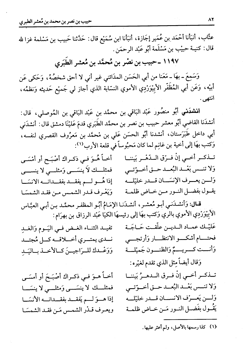 1197 - حبيب بن نصر بن محمد بن معشر الطبري وسمع بها من أبي الحسن المدائني غير أني لا أحق شخصه وحكى عن أبيه وعن أبي وعن أبي المظفر الأبيوردي الأموي النسابة الذي أجاز لي جميع حديثه ونظمه انتهى أنشدني أبو منصور عبد الباقي بن محمد بن عبد الباقي بن الموصلي قال أنشدنا القاضي أبو معشر حبيب بن نصر بن محمد الطبري قدم علينا دمشق قال أنشدني أبي داخل طبرستان أنشدنا أبو الحسن علي بن محمد بن معروف القصري لنفسه وكتب بها إلى أخيه بن غانم لما كان محبوسا في قلعة الأرب (1) تذكر أخي إن فرق الدهر بيننا * أخا هو في ذكراك أصبح أو أمسى ولا تنس بعد البعد حق أخوتي * فمثلك لا ينسى ومثلي لا ينسى ولن يعرف الإنسان قدر خليله * إذا هو لم يفقد بفقدانه الأنسا يقول بفضل النور من خاض ظلمة * ويعرف قدر الشمس من فقد الشمسا * قال وأنشدني أبو معشر أنشدنا الإمام أبو المظفر محمد بن أبي العباس الأبيوردي الأموي بالري وكتب بها إلى رئيسها الكيا عبد الرزاق بن بهرام عليك عماد الدين علقت حاجة * تفيد الثناء الغض في اليوم والغد * فحتام أشكو الانتظار وأرتجي * ندى يمتري أخلاقه كل مجتد وأنت كريم والظنون جميلة * ووعدك للراجين كالأخذ باليد * وقال أيضا مثل الذي تقدم لغيره تذكر أخي إن فرق الدهر بيننا * أخا هو في ذكراك أصبح أو أمسى ولا تنس بعد البعد حق أخوتي * فمثلك لا ينسى ومثلي لا ينسا ولن يعرف الإنسان قدر خليله * إذا هو لم يفقد يفقدانه الأنسا يقول بفضل النور من خاض ظلمة * ويعرف قدر الشمس من فقد الشمسا *
