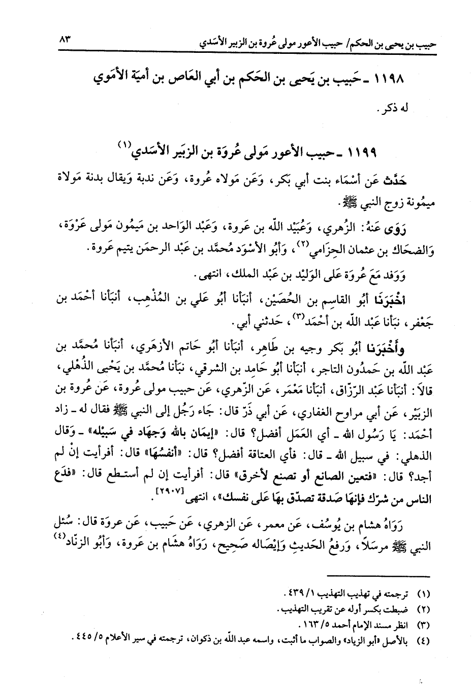 1199 - حبيب الأعور مولى عروة بن الزبير الأسدي (1) حدث عن أسماء بنت أبي بكر وعن مولاه عروة وعن ندبة ويقال بدنة مولاة ميمونة زوج النبي (صلى الله عليه وسلم) روى عنه الزهري وعبيد الله بن عروة وعبد الواحد بن ميمون مولى عروة والضحاك بن عثمان الحزامي (2) وأبو الأسود محمد بن عبد الرحمن يتيم عروة ووفد مع عروة على الوليد بن عبد الملك انتهى أخبرنا أبو القاسم بن الحصين أنبأنا أبو علي بن المذهب أنبأنا أحمد بن جعفر نبأنا عبد الله بن أحمد (3) حدثني أبي وأخبرنا أبو بكر وجيه بن طاهر أنبأنا أبو حاتم الأزهري أنبأنا محمد بن عبد الله بن حمدون التاجر أنبأنا أبو حامد بن الشرقي نبأنا محمد بن يحيى الذهلي قالا أنبأنا عبد الرزاق أنبأنا معمر عن الزهري عن حبيب مولى عروة عن عروة بن الزبير عن أبي مراوح الغفاري عن أبي ذر قال جاء رجل إلى النبي (صلى الله عليه وسلم) فقال له زاد أحمد يا رسول الله أي العمل أفضل قال إيمان بالله وجهاد في سبيله وقال الذهلي في سبيل الله قال فأي العتاقة أفضل قال أنفسها قال أفرأيت إن لم أجد قال فتعين الصانع أو تصنع لأخرق قال أفرأيت إن لم أستطع قال فدع الناس من شرك فإنها صدقة تصدق بها على نفسك انتهى رواه هشام بن يوسف عن معمر عن الزهري عن حبيب عن عروة قال سئل النبي (صلى الله عليه وسلم) مرسلا ورفع الحديث وإيصاله صحيح رواه هشام بن عروة وأبو الزناد (4)