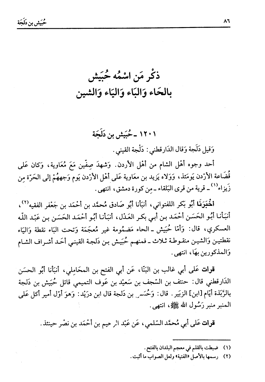 1201 - حبيش بن دلجة وقيل دلجة وقال الدارقطني دلجة القيني أحد وجوه أهل الشام من أهل الأردن وشهد صفين مع معاوية وكان على قضاعة الأردن يومئذ وولاه يزيد بن معاوية على أهل الأردن يوم وجههم إلى الحرة من زيزاء (1) قرية من قرى البلقاء من كورة دمشق انتهى أخبرنا أبو بكر اللفتواني أنبأنا أبو صادق محمد بن أحمد بن جعفر الفقيه (2) أنبأنا أبو الحسن أحمد بن أبي بكر العدل أنبأنا أبو أحمد الحسن بن عبد الله العسكري قال وأما حبيش الحاء مضمومة غير معجمة وتحت الباء نقطة والياء نقطتين والشين منقوطة ثلاث فمنهم حبيش بن دلجة القيني أحد أشراف الشام والمذكورين بها انتهى قرأت على أبي غالب بن البنا عن أبي الفتح بن المحاملي أنبأنا أبو الحسن الدارقطني قال حنتف بن السجف بن سعيد بن عوف التميمي قاتل حبيش بن دلجة بالربذة أيام ابن الزبير قال وحبيش بن دلجة قال ابن دريد وهو أول أمير أكل على المنبر منبر رسول الله (صلى الله عليه وسلم) انتهى قرأت على أبي محمد السلمي عن عبد الرحيم بن أحمد بن نصر حينئذ