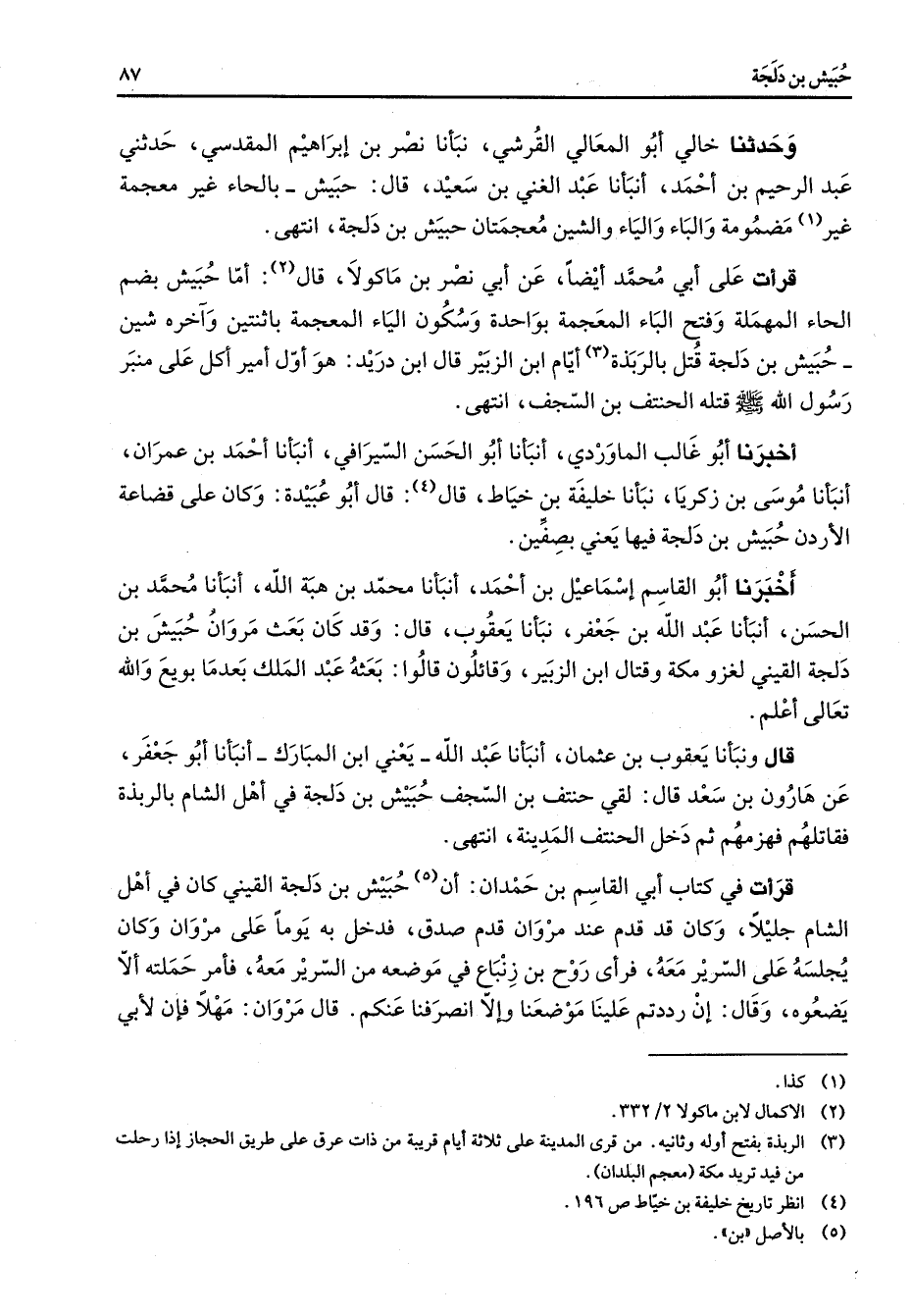 وحدثنا خالي أبو المعالي القرشي نبأنا نصر بن إبراهيم المقدسي حدثني عبد الرحيم بن أحمد أنبأنا عبد الغني بن سعيد قال حبيش بالحاء غير معجمة غير (1) مضمومة والباء والياء والشين معجمتان حبيش بن دلجة انتهى قرأت على أبي محمد أيضا عن أبي نصر بن ماكولا قال (2) أما حبيش بضم الحاء المهملة وفتح الباء المعجمة بواحدة وسكون الياء المعجمة باثنتين وآخره شين حبيش بن دلجة قتل بالربذة (3) أيام ابن الزبير قال ابن دريد هو أول أمير أكل على منبر رسول الله (صلى الله عليه وسلم) قتله الحنتف بن السجف انتهى أخبرنا أبو غالب الماوردي أنبانا أبو الحسن السيرافي أنبأنا أحمد بن عمران أنبأنا موسى بن زكريا نبأنا خليفة بن خياط قال (4) قال أبو عبيدة وكان على قضاعة الأردن حبيش بن دلجة فيها يعني بصفين أخبرنا أبو القاسم إسماعيل بن أحمد أنبأنا محمد بن هبة الله أنبانا محمد بن الحسن أنبأنا عبد الله بن جعفر نبأنا يعقوب قال وقد كان بعث مروان حبيش بن دلجة القيني لغزو مكة وقتال ابن الزبير وقائلون قالوا بعثه عبد الملك بعدما بويع والله تعالى أعلم قال ونبأنا يعقوب بن عثمان أنبأنا عبد الله يعني ابن المبارك أنبأنا أبو جعفر عن هارون بن سعد قال لقي حنتف بن السجف حبيش بن دلجة في أهل الشام بالربذة فقاتلهم فهزمهم ثم دخل الحنتف المدينة انتهى قرأت في كتاب أبي القاسم بن حمدان أن (5) حبيش بن دلجة القيني كان في أهل الشام جليلا وكان قد قدم عند مروان قدم صدق فدخل به يوما على مروان وكان يجلسه على السرير معه فرأى روح بن زنباع في موضعه من السرير معه فأمر حملته ألا يضعوه وقال إن رددتم علينا موضعنا وإلا انصرفنا عنكم قال مروان مهلا فإن لأبي