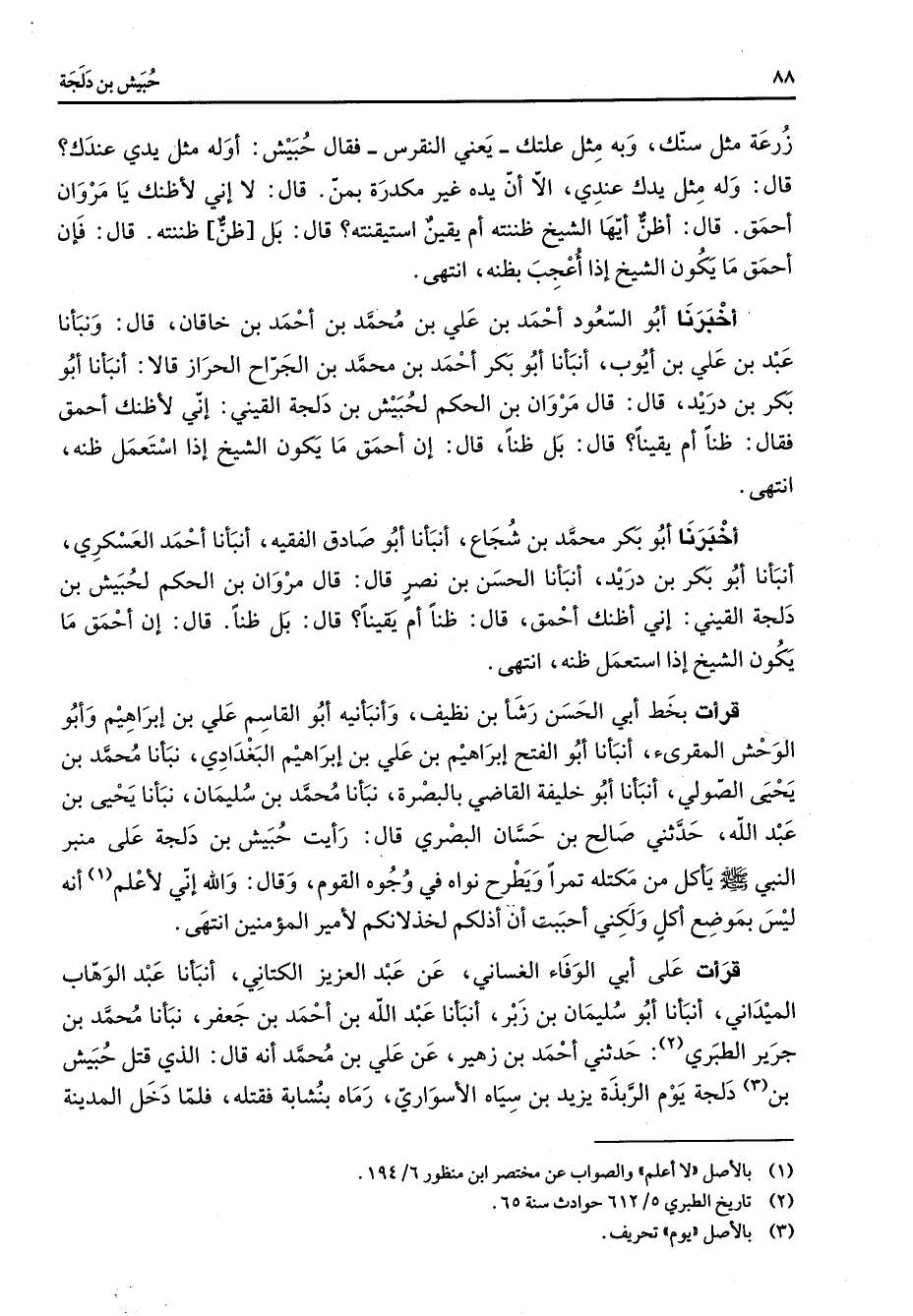 زرعة مثل سنك وبه مثل علتك يعني النقرس فقال حنيش أوله مثل يدي عندك قال وله مثل يدك عندي إلا أن يده غير مكدرة بمن قال لا إني لأظنك يا مروان أحمق قال أظن أيها الشيخ ظننته أم يقين استيقنته قال بل ظن ظننته قال فإن أحمق ما يكون الشيخ إذا أعجب بظنه انتهى أخبرنا أبو السعود أحمد بن علي بن محمد بن أحمد بن خاقان قال ونبأنا عبد بن علي بن أيوب أنبأنا أبو بكر أحمد بن محمد بن الجراح الحراز قالا أنبأنا أبو بكر بن دريد قال قال مروان بن الحكم لحبيش بن دلجة القيني إني لأظنك أحمق فقال ظنا أم يقينا قال بل ظنا قال إن أحمق ما يكون الشيخ إذا استعمل ظنه انتهى أخبرنا أبو بكر محمد بن شجاع أنبأنا أبو صادق الفقيه أنبأنا أحمد العسكري أنبأنا أبو بكر بن دريد أنبأنا الحسن بن نصر قال قال مروان بن الحكم لحبيش بن دلجة القيني إني أظنك أحمق قال ظنا أم يقينا قال بل ظنا قال إن أحمق ما يكون الشيخ إذا استعمل ظنه انتهى قرأت بخط أبي الحسن رشأ بن نظيف وأنبأنيه أبو القاسم علي بن إبراهيم وأبو الوحش المقرئ أنبأنا أبو الفتح إبراهيم بن علي بن إبراهيم البغدادي نبأنا محمد بن يحيى الصولي أنبأنا أبو خليفة القاضي بالبصرة نبأنا محمد بن سليمان نبأنا يحيى بن عبد الله حدثني صالح بن حسان البصري قال رأيت حبيش بن دلجة على منبر النبي (صلى الله عليه وسلم) يأكل من مكتله تمرا ويطرح نواه في وجوه القوم وقال والله إني لأعلم (1) أنه ليس بموضع أكل ولكني أحببت أن أذلكم لخذلانكم لأمير المؤمنين انتهى قرأت على أبي الوفاء الغساني عن عبد العزيز الكتاني أنبأنا عبد الوهاب الميداني أنبأنا أبو سليمان بن زبر أنبأنا عبد الله بن أحمد بن جعفر نبأنا محمد بن جرير الطبري (2) حدثني أحمد بن زهير عن علي بن محمد أنه قال الذي قتل حبيش بن (3) دلجة يوم الربذة يزيد بن سياه الأسواري رماه بنشابة فقتله فلما دخل المدينة