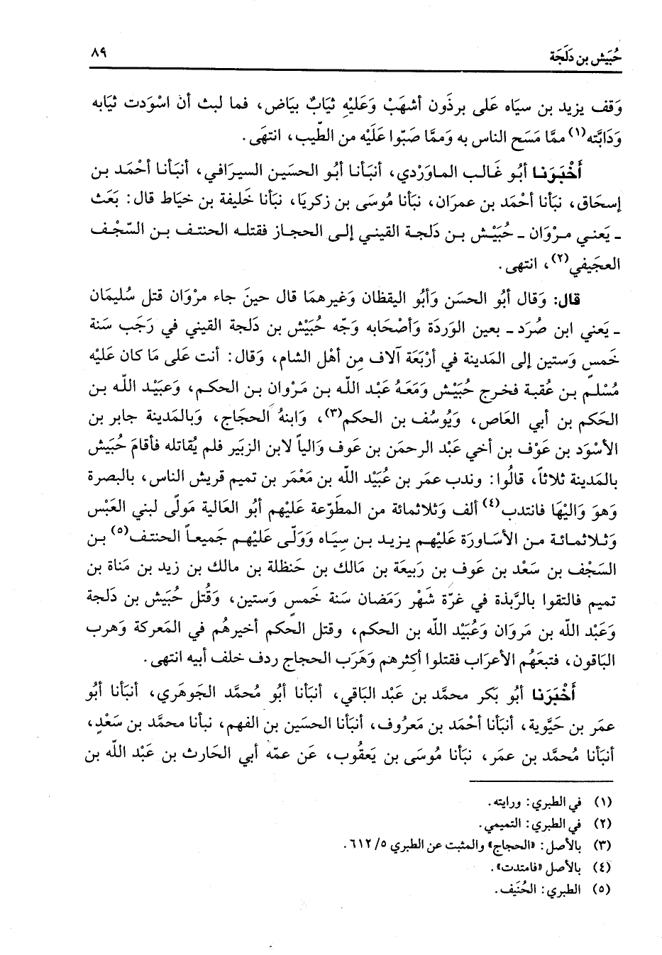 وقف يزيد بن سياه على برذون أشهب وعليه ثياب بياض فما لبث أن اسودت ثيابه ودابته (1) مما مسح الناس به ومما صبوا عليه من الطيب انتهى أخبرنا أبو غالب الماوردي أنبأنا أبو الحسين السيرافي أنبأنا أحمد بن إسحاق نبأنا أحمد بن عمران نبأنا موسى بن زكريا نبأنا خليفة بن خياط قال بعث يعني مروان حبيش بن دلجة القيني إلى الحجاز فقتله الحنتف بن السجف العجيفي (2) انتهى قال وقال أبو الحسن وأبو اليقظان وغيرهما قال حين جاء مروان قتل سليمان يعني ابن صرد بعين الوردة وأصحابه وجه حبيش بن دلجة القيني في رجب سنة خمس وستين إلى المدينة في أربعة آلاف من أهل الشام وقال أنت على ما كان عليه مسلم بن عقبة فخرج حبيش ومعه عبد الله بن مروان بن الحكم وعبيد الله بن الحكم بن أبي العاص ويوسف بن الحكم (3) وابنه الحجاج وبالمدينة جابر بن الأسود بن عوف بن أخي عبد الرحمن بن عوف واليا لابن الزبير فلم يقاتله فأقام حبيش بالمدينة ثلاثا قالوا وندب عمر بن عبيد الله بن معمر بن تميم قريش الناس بالبصرة وهو واليها فانتدب (4) ألف وثلاثمائة من المطوعة عليهم أبو العالية مولى لبني العبس وثلاثمائة من الأساورة عليهم يزيد بن سياه وولى عليهم جميعا الحنتف (5) بن السجف بن سعد بن عوف بن ربيعة بن مالك بن حنظلة بن مالك بن زيد بن مناة بن تميم فالتقوا بالربذة في غرة شهر رمضان سنة خمس وستين وقتل حبيش بن دلجة وعبد الله بن مروان وعبيد الله بن الحكم وقتل الحكم أخيرهم في المعركة وهرب الباقون فتبعهم الأعراب فقتلوا أكثرهم وهرب الحجاج ردف خلف أبيه انتهى أخبرنا أبو بكر محمد بن عبد الباقي أنبأنا أبو محمد الجوهري أنبأنا أبو عمر بن حيوية أنبأنا أحمد بن معروف أنبأنا الحسين بن الفهم نبأنا محمد بن سعد أنبأنا محمد بن عمر نبأنا موسى بن يعقوب عن عمه أبي الحارث بن عبد الله بن