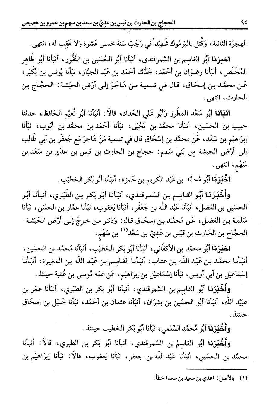 الهجرة الثانية وقتل باليرموك شهيدا في رجب سنة خمس عشرة ولا عقب له انتهى أخبرنا أبو القاسم بن السمرقندي أنبانا أبو الحسين بن النقور أنبأنا أبو طاهر المخلص أنبأنا رضوان بن أحمد حدثنا أحمد بن عبد الجبار نبأنا يونس بن بكير عن محمد بن إسحاق قال في تسمية من هاجر إلى أرض الحبشة الحجاج بن الحارث انتهى أنبأنا أبو سعد المطرز وأبو علي الحداد قالا أنبأنا أبو نعيم الحافظ حدثنا حبيب بن الحسين أنبأنا محمد بن يحيى نبأنا أحمد بن محمد بن أيوب نبأنا إبراهيم بن سعد عن محمد بن إسحاق قال في تسمية من هاجر مع جعفر بن أبي طالب إلى أرض الحبشة من بني سهم حجاج بن الحارث بن قيس بن عدي بن سعد بن سهم انتهى وأخبرنا أبو محمد بن عبد الكريم بن حمزة أنبأنا أبو بكر الخطيب وأخبرنا أبو القاسم بن السمرقندي أنبأنا أبو بكر بن الطبري أنبأنا أبو الحسين بن الفضل أنبأنا عبد الله بن جعفر أنبأنا يعقوب نبأنا عمار بن الحسن نبأنا سلمة بن الفضل عن محمد بن إسحاق قال وذكر من خرج إلى أرض الحبشة الحجاج بن الحارث بن قيس بن عدي بن سعد (1) بن سهم أخبرنا أبو محمد بن الأكفاني أنبأنا أبو بكر الخطيب أنبأنا محمد بن الحسين أنبأنا محمد بن عبد الله بن عتاب أنبأنا القاسم بن عبد الله بن المغيرة أنبأنا إسماعيل بن أبي أويس نبأنا إسماعيل بن إبراهيم عن عمه موسى بن عقبة حينئذ وأخبرنا أبو القاسم بن السمرقندي أنبأنا أبو بكر بن الطبري أنبأنا عمر بن عبيد الله أنبأنا أبو الحسين بن بشران أنبأنا عثمان بن أحمد نبأنا حنبل بن إسحاق حينئذ وأخبرنا أبو محمد السلمي نبأنا أبو بكر الخطيب حينئذ وأخبرنا أبو القاسم بن السمرقندي أنبأنا أبو بكر بن الطبري قالا أنبأنا محمد بن الحسين أنبأنا عبد الله بن جعفر نبأنا يعقوب قالا نبأنا إبراهيم بن