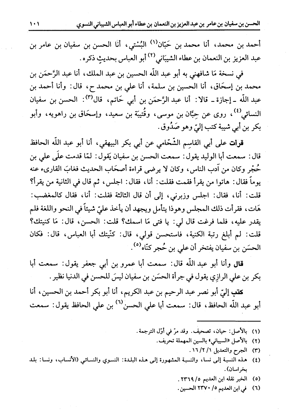 أحمد بن محمد أنا محمد بن حبان (1) البستي أنا الحسن بن سفيان بن عامر بن عبد العزيز بن النعمان بن عطاء الشيباني (2) أبو العباس بحديث ذكره في نسخة ما شافهني به أبو عبد الله الحسين بن عبد الملك أنا عبد الرحمن بن محمد بن إسحاق أنا الحسين بن سلمة أنا علي بن محمد قال وأنا أحمد بن عبد الله إجازة قالا أنا عبد الرحمن بن أبي حاتم قال (3) الحسن بن سفيان النسائي (4) روى عن حبان بن موسى وقتيبة بن سعيد وإسحاق بن راهويه وأبو بكر بن أبي شيبة كتب إلي وهو صدوق قرأت على أبي القاسم الشحامي عن أبي بكر البيهقي أنا أبو عبد الله الحافظ قال سمعت أبا الوليد يقول سمعت الحسن بن سفيان يقول لما قدمت على علي بن حجر وكان من آدب الناس وكان لا يرضى قراءة أصحاب الحديث فغاب القارئ عنه يوما فقال هاتوا من يقرأ فقمت فقلت أنا فقال اجلس ثم قال في الثانية من يقرأ قلت أنا فقال اجلس وزبرني إلى أن قال الثالثة فقلت أنا فقال كالمغضب هات فقرأت ذلك المجلس وهو ذا يتأمل ويجهد أن يأخذ علي شيئا في النحو واللغة فلم يقدر عليه فلما فرغت قال لي يا فتى ما اسمك قلت الحسن قال ما كنيتك قلت لم أبلغ رتبة الكنية فاستحسن قولي قال كنيتك أبا العباس قال فكان الحسن بن سفيان يفتخر أن علي بن حجر كناه (5) قال وأنا أبو عبد الله قال سمعت أبا عمرو بن أبي جعفر يقول سمعت أبا بكر بن علي الرازي يقول في جرأة الحسن بن سفيان ليس للحسن في الدنيا نظير كتب إلي أبو نصر عبد الرحيم بن عبد الكريم أنا أبو بكر أحمد بن الحسين أنا أبو عبد الله الحافظ قال سمعت أبا علي الحسن (6) بن علي الحافظ يقول سمعت