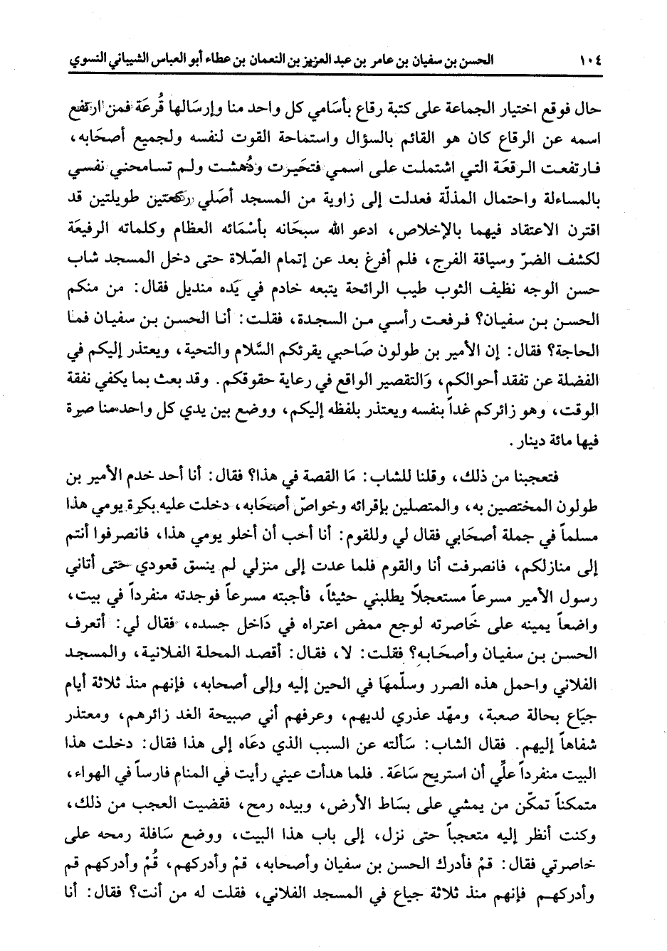 حال فوقع اختيار الجماعة على كتبة رقاع بأسامي كل واحد منا وإرسالها قرعة فمن ارتفع اسمه عن الرقاع كان هو القائم بالسؤال واستماحة القوت لنفسه ولجميع أصحابه فارتفعت الرقعة التي اشتملت على اسمي فتحيرت ودهشت ولم تسامحني نفسي بالمسألة واحتمال المذلة فعدلت إلى زاوية من المسجد أصلي ركعتين طويلتين قد اقترن الاعتقاد فيهما بالإخلاص أدعو الله سبحانه بأسمائه العظام وكلماته الرفيعة لكشف الضر وسياقة الفرج فلم أفرغ بعد عن إتمام الصلاة حتى دخل المسجد شاب حسن الوجه نظيف الثوب طيب الرائحة يتبعه خادم في يده منديل فقال من منكم الحسن بن سفيان فرفعت رأسي من السجدة فقلت أنا الحسن بن سفيان فما الحاجة فقال إن الأمير بن طولون صاحبي يقرئكم السلام والتحية ويعتذر إليكم في الفضلة عن تفقد أحوالكم والتقصير الواقع في رعاية حقوقكم وقد بعث بما يكفي نفقة الوقت وهو زائركم غدا بنفسه ويعتذر بلفظه إليكم ووضع بين يدي كل واحد مناصرة فيها مائة دينار فتعجبنا من ذلك وقلنا للشاب ما القصة في هذا فقال أنا أحد خدم الأمير بن طولون المختصين به والمتصلين بإقرائه وخواص أصحابه دخلت عليه بكرة يومي هذا مسلما في جملة أصحابي فقال لي وللقوم أنا أحب أن أخلو يومي هذا فانصرفوا أنتم إلى منازلكم فانصرفت أنا والقوم فلما عدت إلى منزلي لم ينسق قعودي حتى أتاني رسول الأمير مسرعا مستعجلا يطلبني حثيثا فأجبته مسرعا فوجدته منفردا في بيت واضعا يمينه على خاصرته لوجع ممض اعتراه في داخل جسده فقال لي أتعرف الحسن بن سفيان وأصحابه فقلت لا فقال أقصد المحلة الفلانية والمسجد الفلاني واحمل هذه الصرر وسلمها في الحين إليه وإلي أصحابه فإنهم منذ ثلاثة أيام جياع بحالة صعبة ومهد عذري لديهم وعرفهم أني صبيحة الغد زائرهم ومعتذر شفاها إليهم فقال الشاب سألته عن السبب الذي دعاه إلى هذا فقال دخلت هذا البيت منفردا علي أن أستريح ساعة فلما هدأت عيني رأيت في المنام فارسا في الهواء متمكنا تمكن من يمشي على بساط الأرض وبيده رمح فقضيت العجب من ذلك وكنت أنظر إليه متعجبا حتى نزل إلى باب هذا البيت ووضع سافلة رمحه على خاصرتي فقال قم فأدرك الحسن بن سفيان وأصحابه قم وأدركهم قم وأدركهم قم وأدركهم فإنهم منذ ثلاثة جياع في المسجد الفلاني فقلت له من أنت فقال أنا